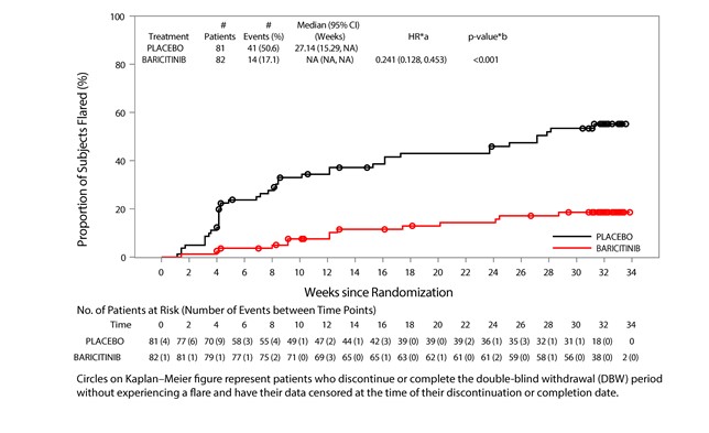 Figure 1. Time to disease flare comparison between baricitinib and placebo during 32 week DBW