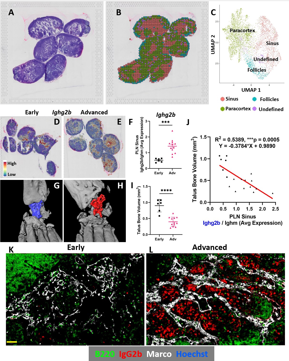 Figure 1. Increased IgG2b expression in PLN sinuses correlates with reduced bone volume in the afferent ankle joint. PLNs from TNF-Tg mice were harvested and processed for spatial transcriptomics. A representative H&E-stained image (A) corresponds to a transcriptional representation (B) of the PLNs from an Advanced capture area where the sinus regions are shown by red spots (C). Differential gene expression of Ighg2b (IgG2b) within the sinus regions are shown by a spatial feature plot overlying the H&E-stained PLNs from Early (D) and Advanced (E) groups with a significant increase in Ighg2b/Ighm expression in Advanced sinuses (p < 0.001) (F). Ex-vivo micro-CT was performed on the hindpaws of TNF-Tg mice with Early (G) and Advanced (H) arthritis with a significant reduction in talus bone volumes in Advanced TNF-Tg mice (p < 0.0001) (I). Linear regression analysis demonstrated negative correlation between PLN sinus Ighg2b expression and talus bone volumes in the afferent ankles (R2 = 0.54, p < 0.001) (J). The increase in IgG2b+ cells in Advanced vs Early TNF-Tg PLNs was validated by immunofluorescence. IgG2b+ cells are limited in Early PLNs (K), while Advanced arthritis is associated with a dramatic accumulation of IgG2b+ (red) / B220- (green) plasma cells localized to the Marco+ (white) PLN peri-follicular medullary sinuses (L). Statistics: Unpaired t-test (F, I); linear regression (J); ***p < 0.001, ****p < 0.0001. Scale bar (yellow) = 50μm (K, L).