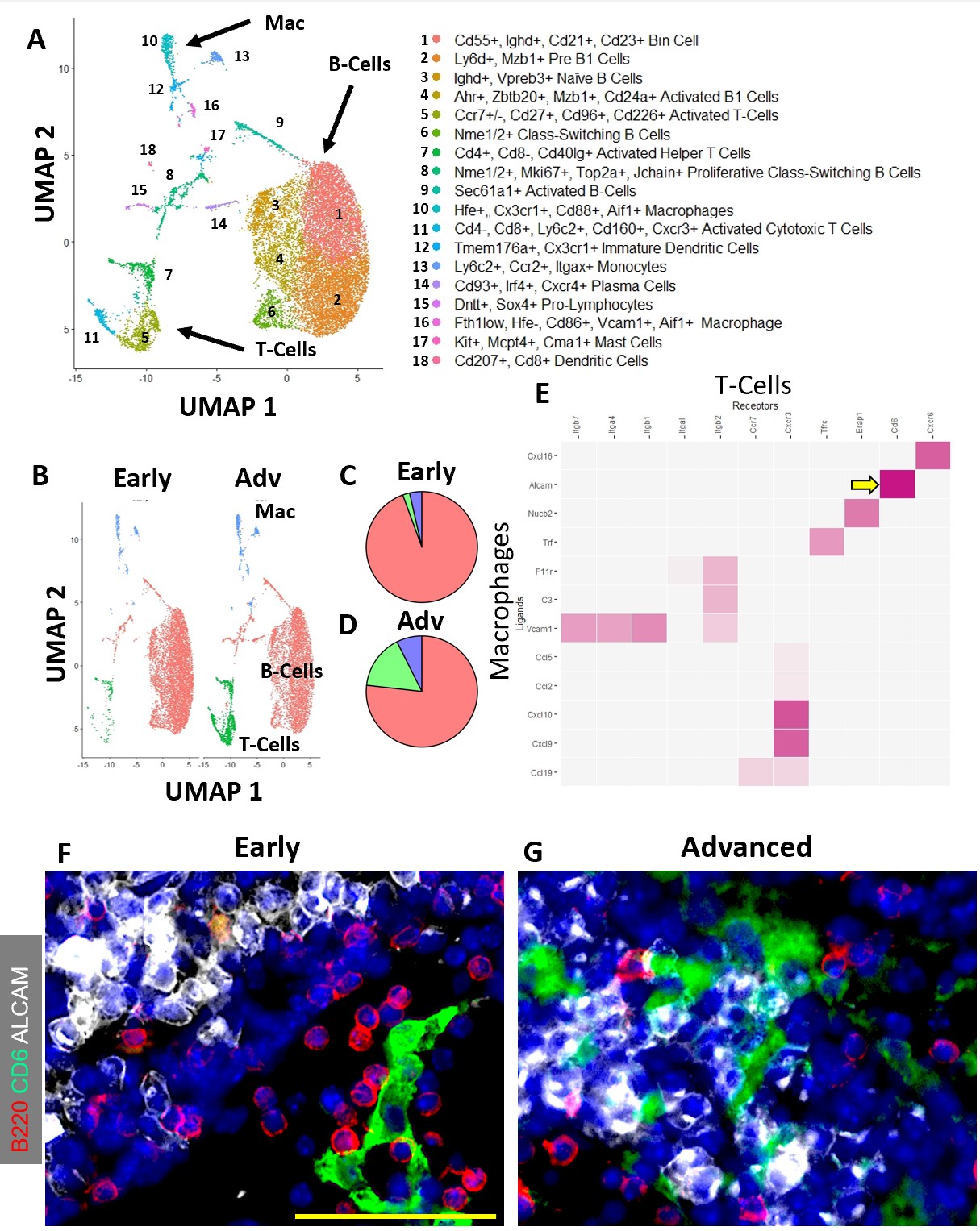 Figure 2. Increased IgG2b+ plasma cells in Advanced PLNs with predicted Alcam+ macrophage and CD6+ T-cell co-stimulation. Single-cell suspensions were collected from Early and Advanced TNF-Tg PLNs (n=3 mice, 6 PLNs pooled/group), flow sorted for Hoechst+ / Sytox- live cells, and processed for scRNAseq. Following integration of the Early (8192 cells) and Advanced (8136 cells) samples, unsupervised clustering in Seurat resolved 18 distinct cell clusters (A), representing subtypes of B-cells, T-cells, and macrophages (B). Comparison of Early vs Advanced PLNs demonstrated a substantial increase in the number of T-cells (green; Early 2.0% (C) vs Adv 15.8% (D)). A remarkable increase was also noted in the proportion of macrophages in Advanced PLNs (3.6% Early (C) vs 7.4% Advanced (D)). Note the color of the pie chart matching the color of unique cell clusters in the UMAP shown in B. To elucidate potential T-cell / macrophage co-stimulatory pathways in Advanced PLNs, cell interaction analysis (NicheNet / Seurat) was performed, which indicated high interaction potential between Alcam (macrophages, ligand) and CD6 (T-cells, receptor) (E, yellow arrow). PLN immunohistochemistry further demonstrated a notable physical separation between Alcam+ and CD6+ cells in the Early condition (F), while these cells were found interacting in close proximity within Advanced PLNs (G). Scale bar (yellow) = 50μm (F, G).