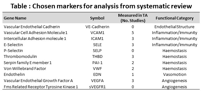 Methods: For the systematic review, a list of VD markers were defined by text mining and a series of literature searches were made to identify studies where each marker was evaluated in TA. Based on the review, 12 markers were chosen (Table) and measured by ELISA in the plasma of 135 TA patients and 52 age and sex matched healthy control (HC) subjects. TA patients were classified as active (n=42), grumbling (n=22) or stable (n=71) using the Indian Takayasu clinical Activity Score along with radiological features and acute phase reactants (incl. PTX3). Blood derived EC were generated from PBMC of 6 patients with active TA and 5 HC. EC phenotype was interrogated by cytokine activation assays and bulk RNA-seq analysis.
