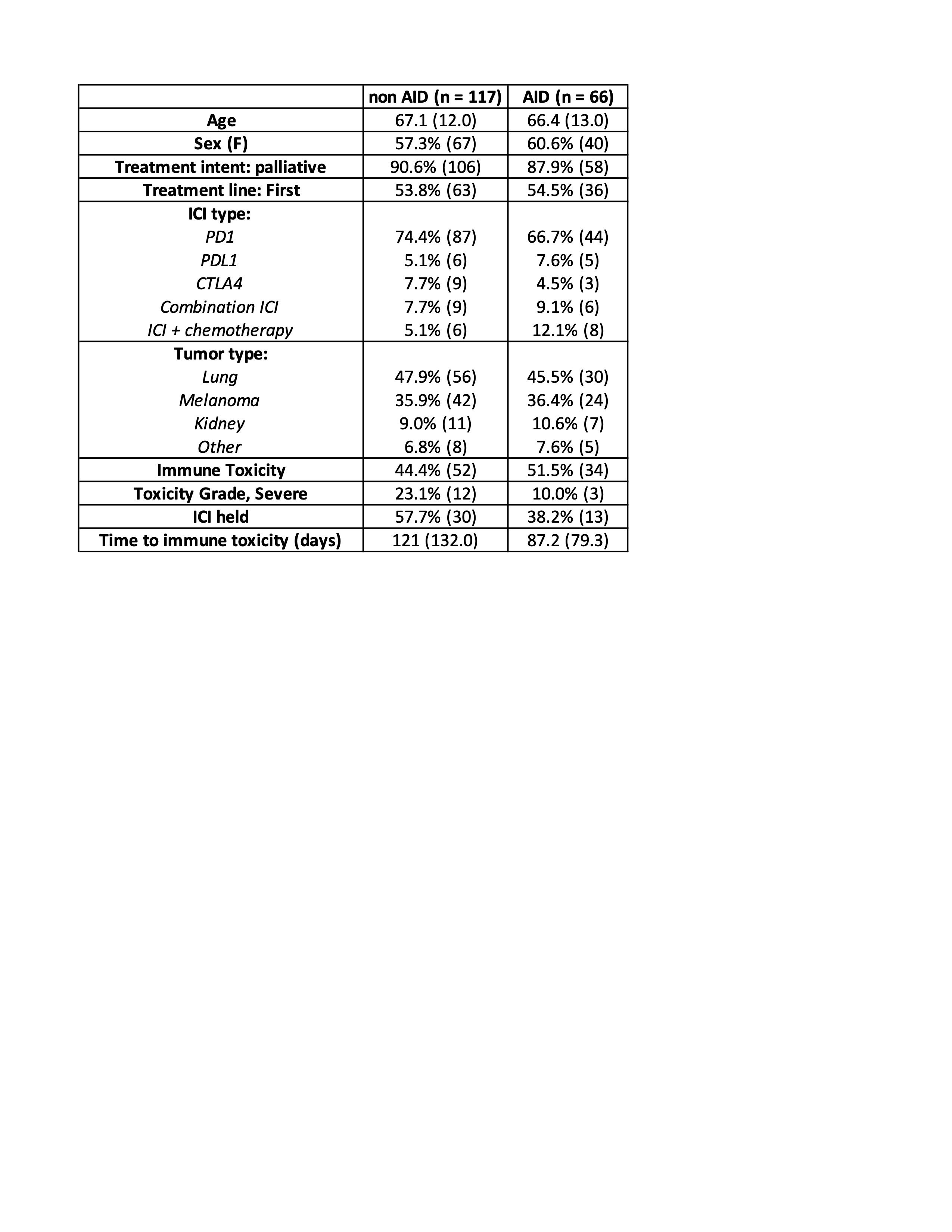 Table 1: Baseline demographics of immune checkpoint inhibitor (ICI) exposed patients with and without pre-existing autoimmune disease (AID). PD: programmed death, PDL: programmed death ligand, CTLA: Cytotoxic T lymphocyte-associated antigen. Continuous data represented as mean (standard deviation), dichotomous data represented as % (n) within group.