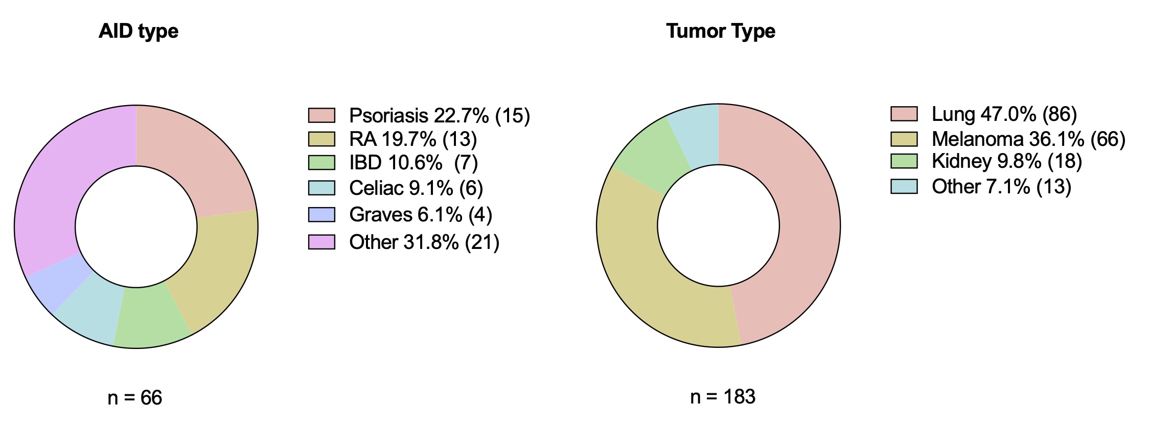 Figure 1: (L) Proportion of autoimmune disease (AID) type (n = 66) (R) Proportion of cancer type across a cohort of immune checkpoint inhibitor exposed patients.