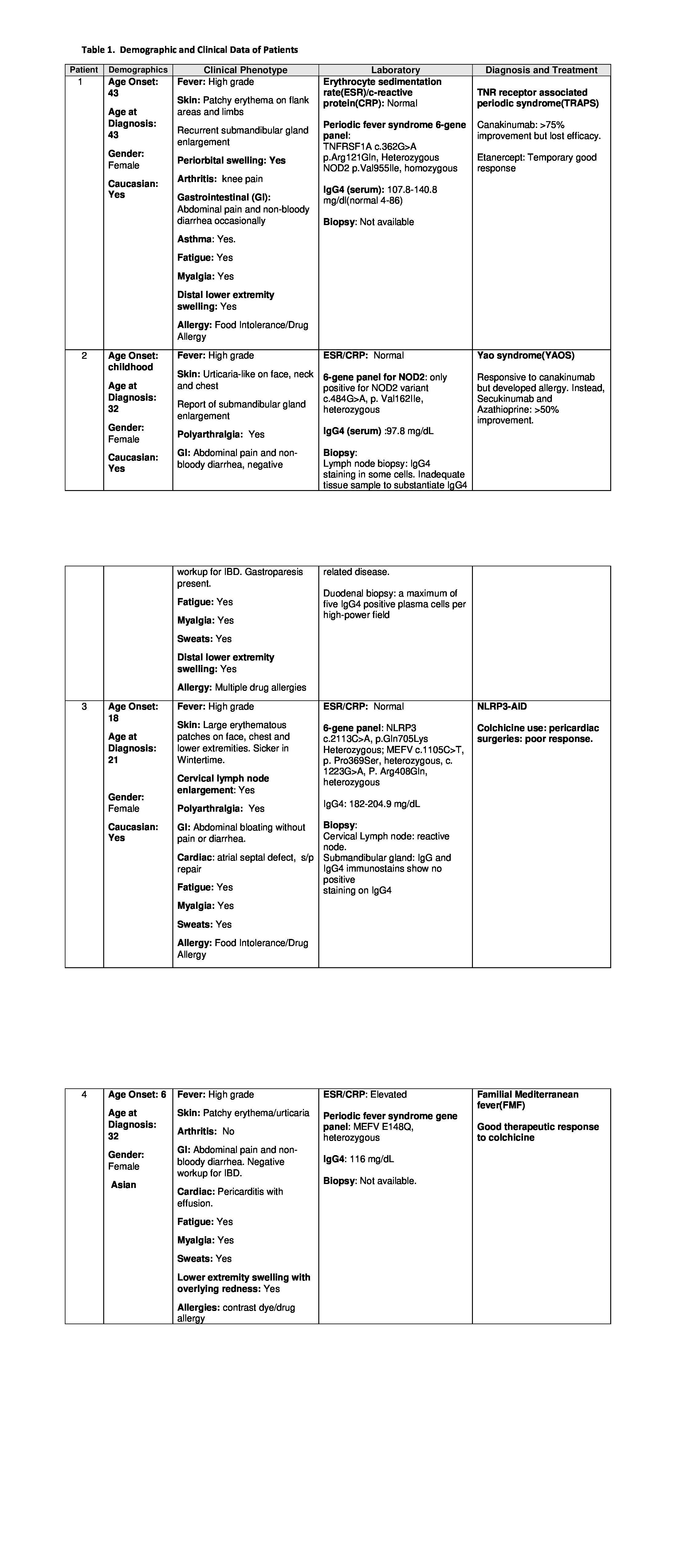 Results: A total of 4 adult patients with SAIDs were included. The demographic, clinical, molecular and theraptic data are listed in Table 1. The mean age at disease diagnosis was 31 years and the average disease duration at diagnosis was 18 years. All patients were females. Patient 1 was diagnosed with TNF receptor associated periodic syndrome(TRAPS) along with elevated serum IgG4 level. Patient 2 was diagnosed with Yao syndrome with elevated serum IgG4 level. Cervical lymph node biopsy showed no adequate IgG4 staining. Patients 3 was diagnosed with NLRP3-AID. Due to the higher levels of serum IgG4, cervial lymph node biopsy did not support IgG4 related disease. Patient 4 was diagnosed with familial Medetranean fever(FMF) with good therapeutic response to colchicine. The patient had temporary serum IgG4 elevation. Our results showed mild to moderate elevation of serum IgG4 levels in all 4 patrients but there was insufficient evidence of IgG4-related disease. All 4 patients reported a history of food or drug allergies that could be associated with IgG4 elevation or SAIDs. All patients reported significant gastrointestinal symptoms without inflammatory bowel disease. Taken together, these data suggest that hyper-IgG4 could be an integral part of certain SAIDs rather than coexistence of both SAID and IgG4-related disease.