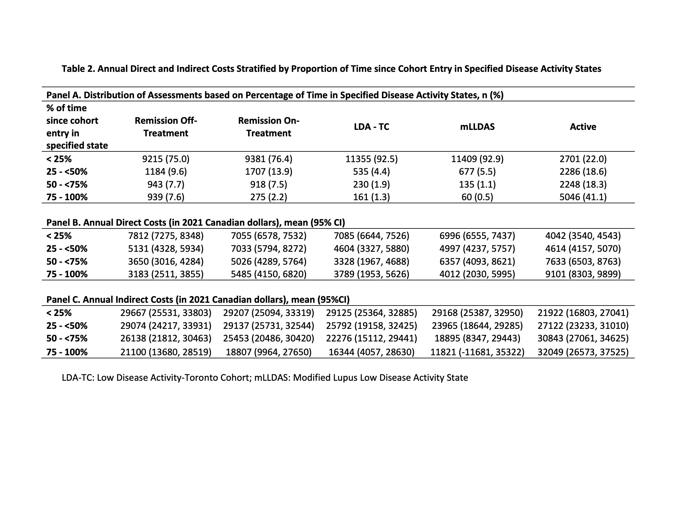 Results: 1631 patients (88.7% female, 48.9% White, mean age at diagnosis 34.5) were followed for a mean of 7.7 (SD 4.7) years. Across 12,281 assessments, 49.3% were classified as active (Table 1, Panel B). Patients spending < 25% vs 75-100% of their time since cohort entry in an active DAS had lower annual DC and IC (DC $4042 vs $9101, difference -$5060, 95%CI -$5983, -$4136; IC $21,922 vs $32,049, difference -$10,127, 95%CI -$16,754, -$3499) (Table 2, Panel B&C).