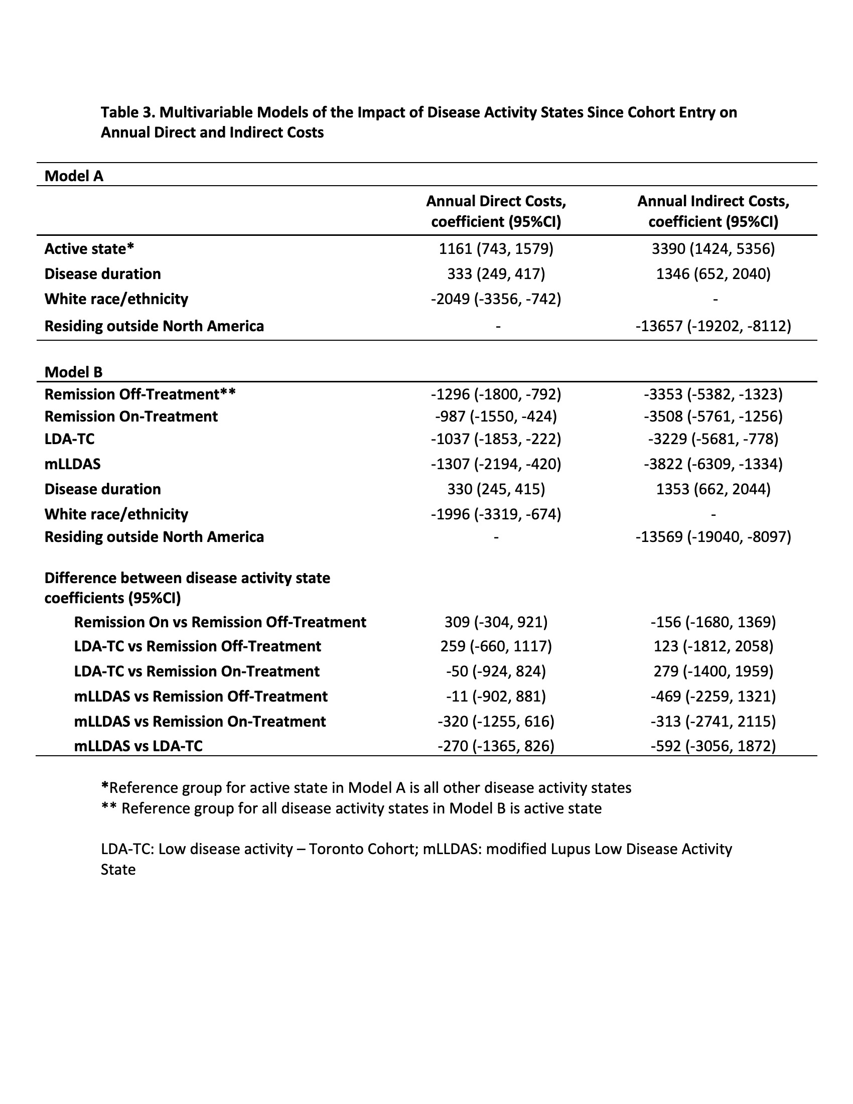 In multivariable models, remission and LDA (per 25% increase in time spent in specified DAS versus active) were associated with lower annual DC and IC: remission off-treatment (DC -$1296, 95%CI -$1800, -$792; IC -$3353, 95%CI -$5382, -$1323), remission on-treatment (DC -$987, 95%CI -$1550, -$424; IC -$3508, 95%CI -$5761, -$1256), LDA-TC (DC -$1037, 95%CI -$1853, -$222; IC -$3229, 95%CI -$5681, -$778) and mLLDAS (DC -$1307, 95%CI -$2194, -$420; IC -$3822, 95%CI -$6309, $-1334) (Table 3, Model B). There were no differences in costs between remission and LDA.