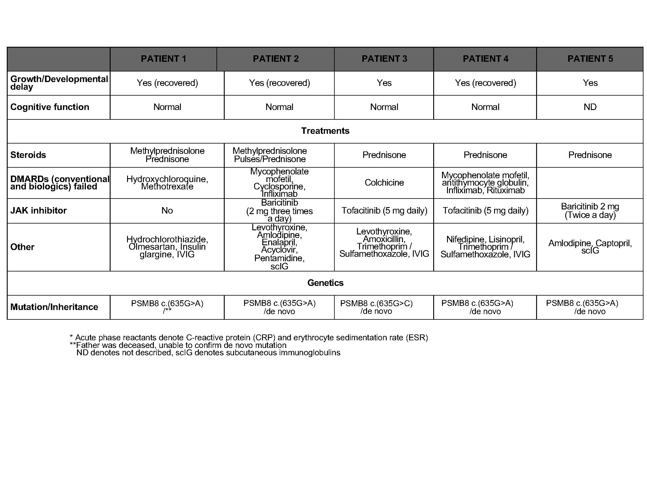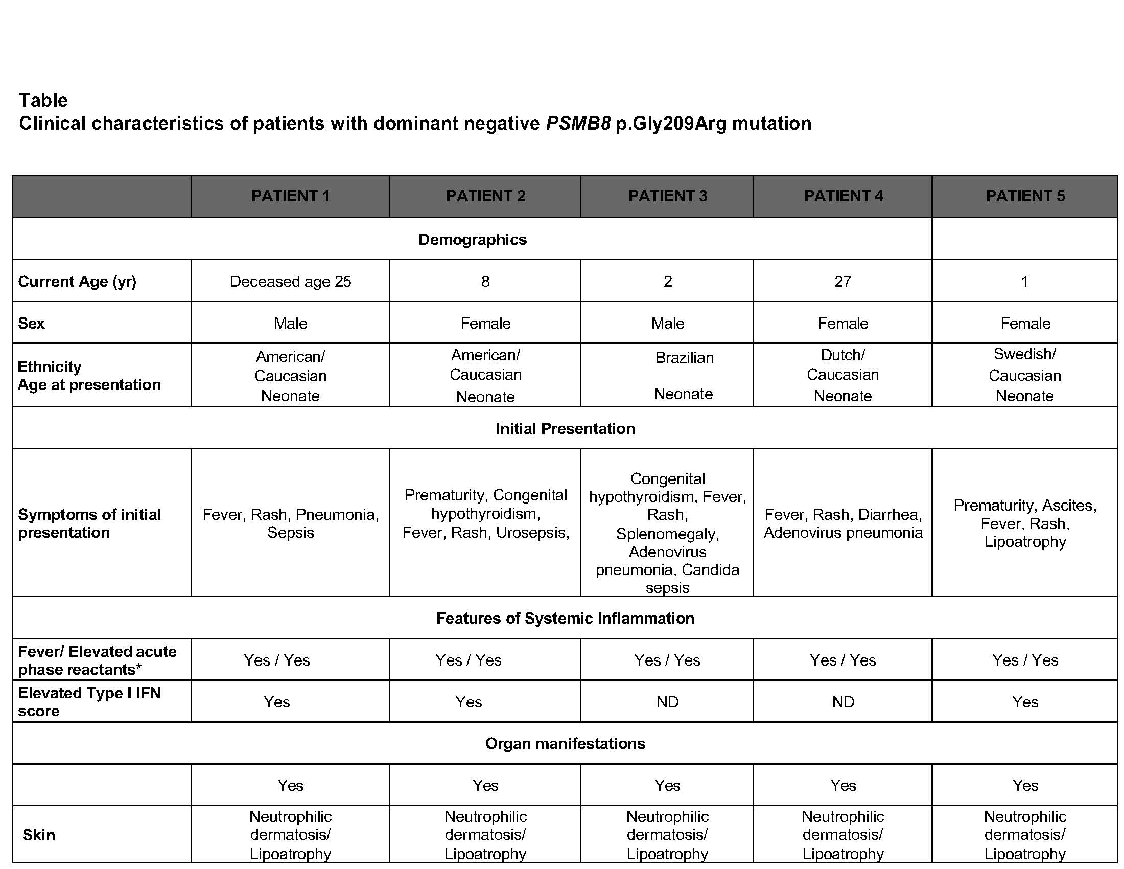Clinical characteristics of patients with dominant negative PSMB8 p.Gly209Arg mutation