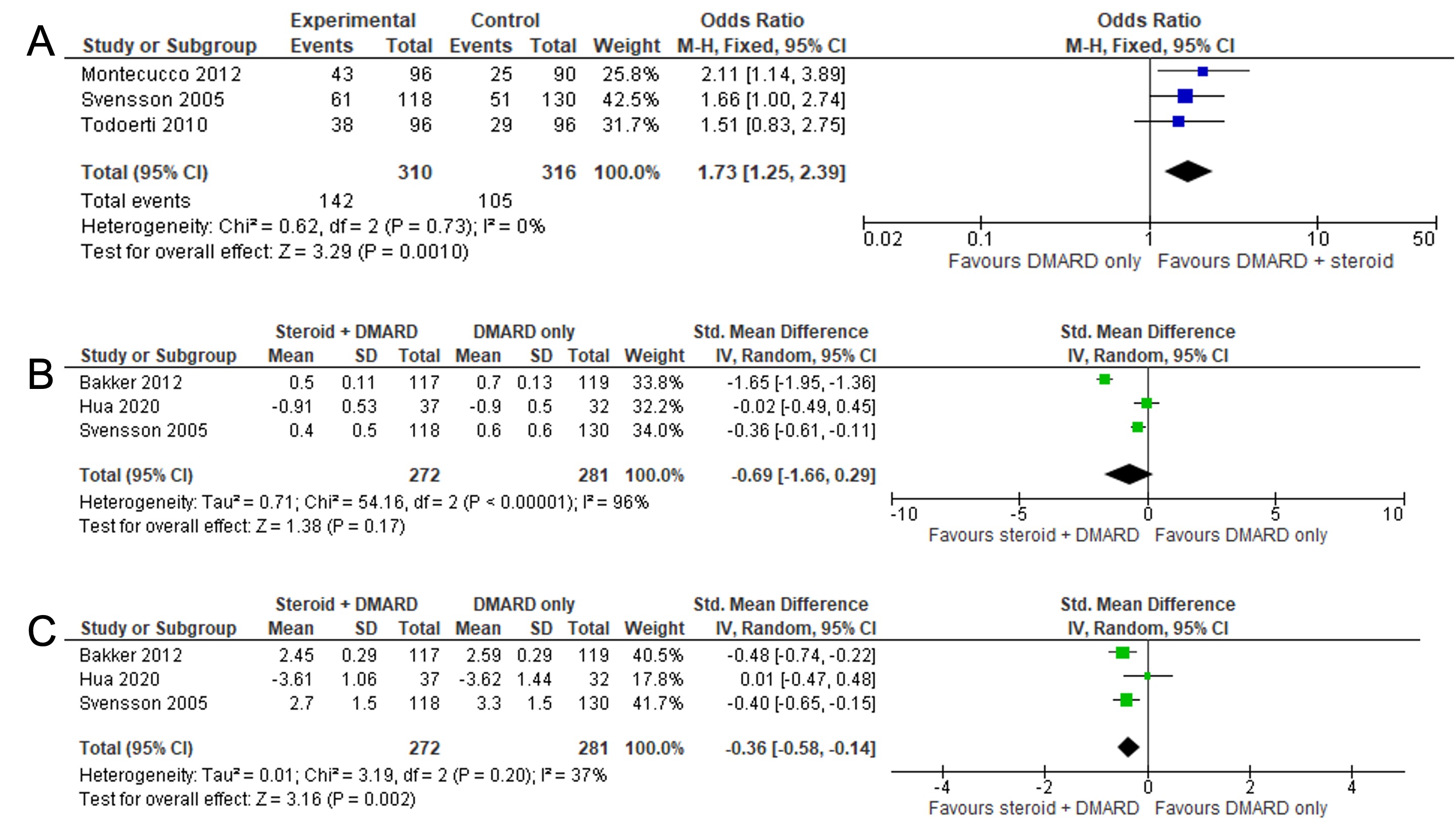 Figure 2: Forest plots for A Achievement of DAS28 remission B reduction in HAQ C Reduction in DAS28