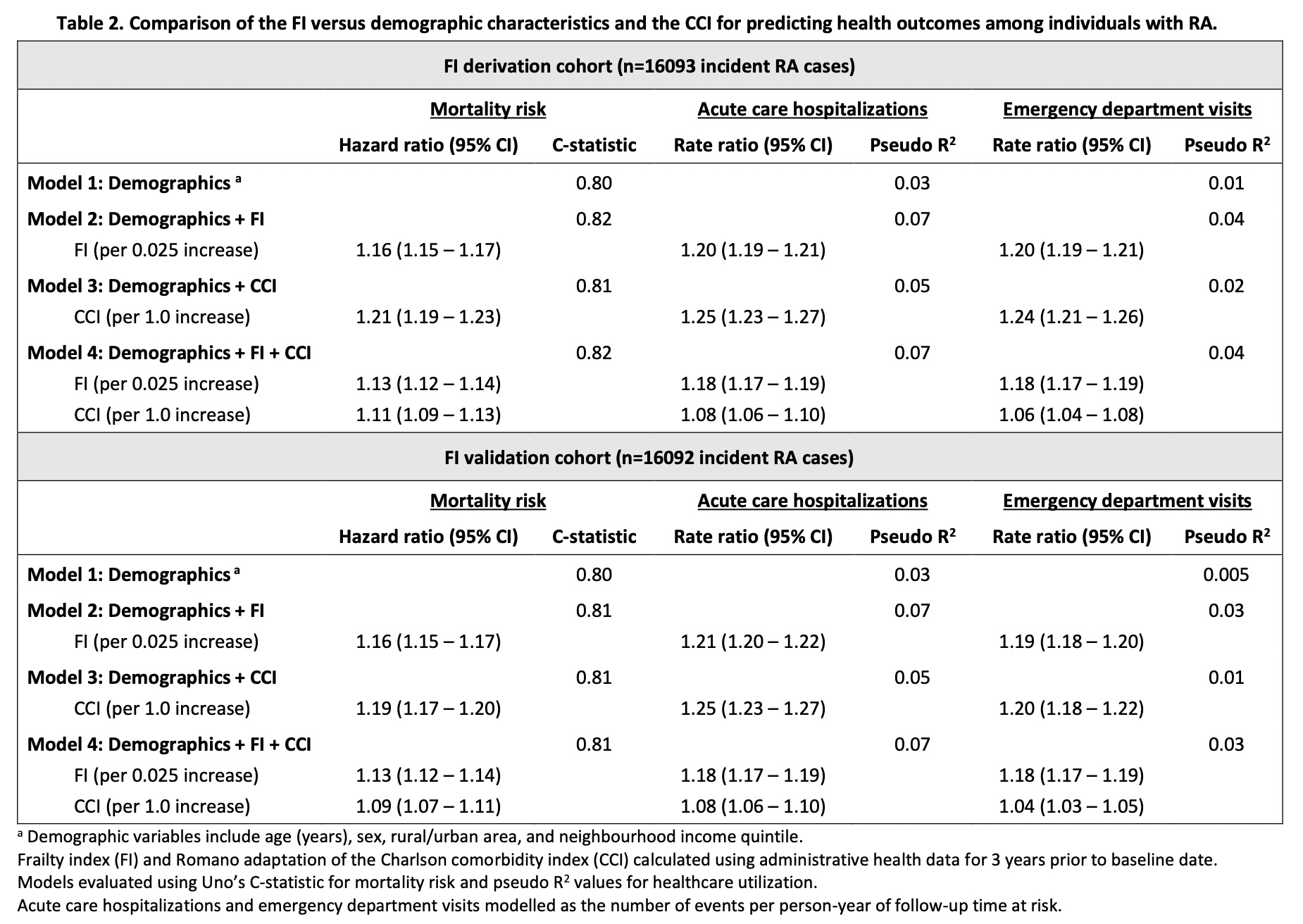 Conclusion: The FI quantifies risk of adverse health outcomes that is not otherwise captured by demographic variables and traditional comorbidity measures in administrative health data. With further validation, the FI is a promising tool for understanding the impact of frailty on health outcomes in RA.