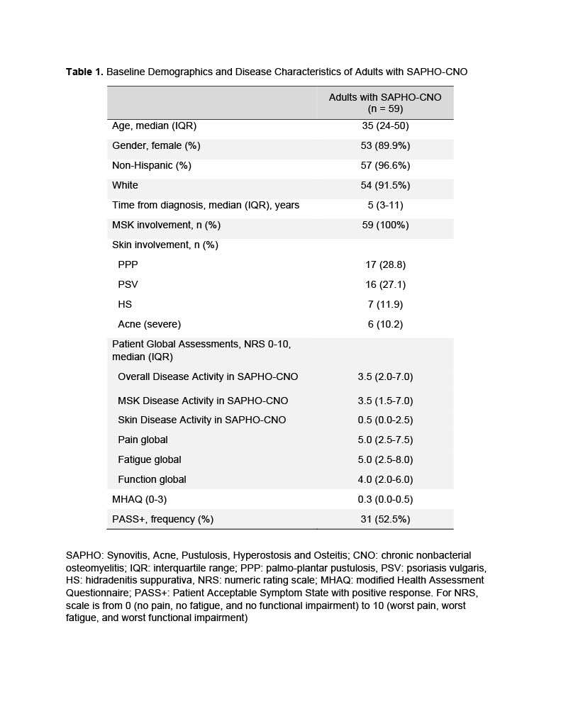 Results: Fifty-nine enrolled subjects completed their baseline study visit and were included in this cross-sectional analysis. Baseline characteristics of the adult SAPHO-CNO cohort are summarized in Table 1. Subjects were predominantly female (89.9%) and Caucasian (91.5%) with a median disease duration of 5 years (IQR, 3-11). All subjects reported MSK involvement, with palmo-plantar pustulosis as the most prevalent skin symptom. Patient global SAPHO-CNO disease activity scores were moderately high, as were patient global scores for pain, fatigue and functional impairment. Overall, 52.5% of subjects in the cohort were in PASS+.
