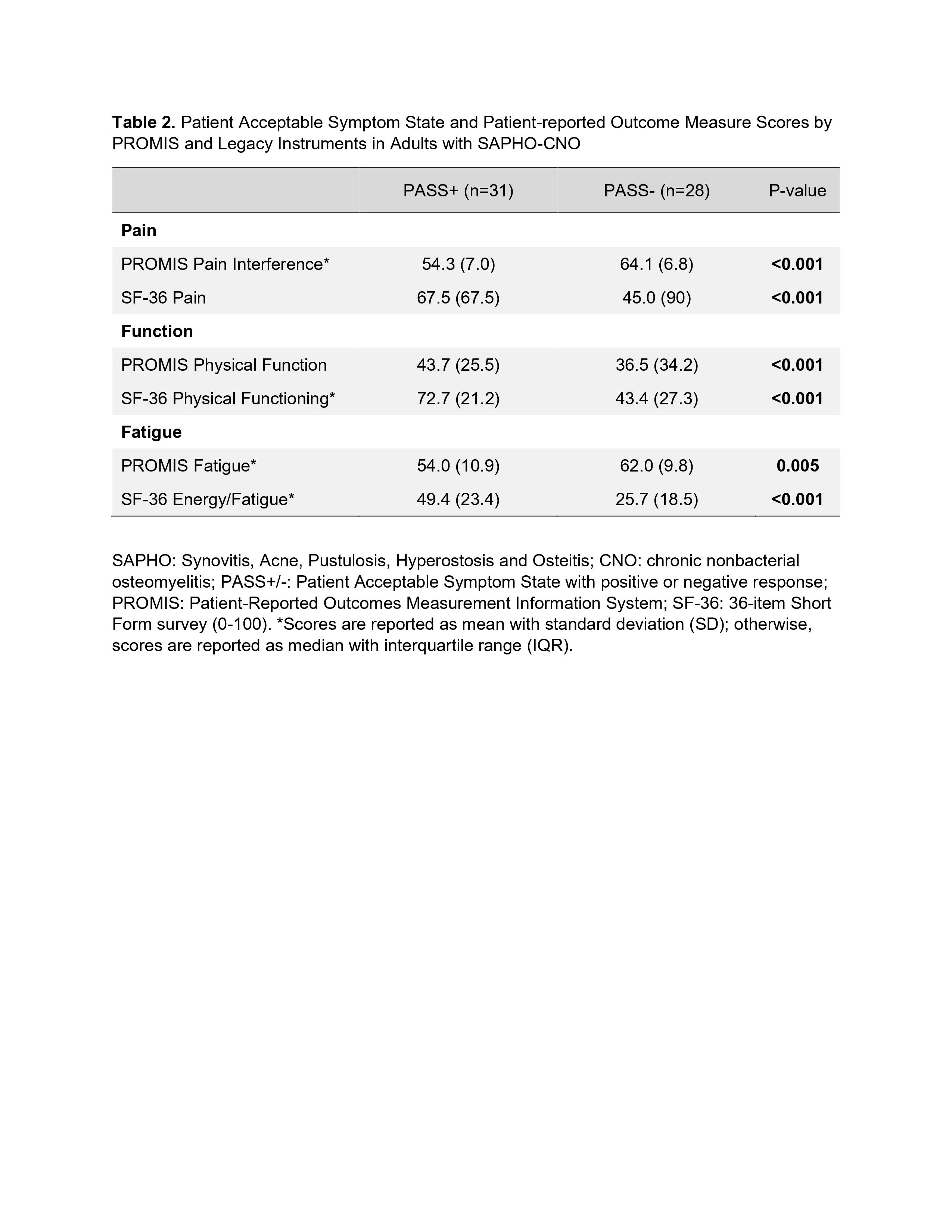 Conclusion: Adult SAPHO-CNO patients who are PASS+ report less pain, fatigue and functional impairment compared with patients who are PASS- in the SAPHO-CNO Study. A multimodal treatment approach for PASS- patients targeting key QOL domains may lead to improved patient outcomes.