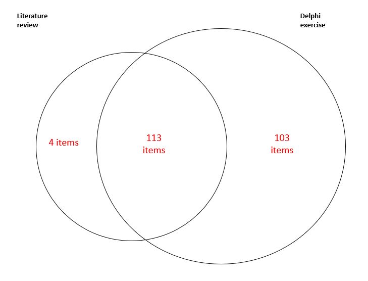 All items in the original SDI were nominated in both processes. Item generation yielded approximately 2,600 items. After rationalising for repetition, redundancy, and harmonisation of synonyms, 220 unique items were identified across 14 organ systems. The literature review proposed 4 (1.8%) unique items, 103 (46.8%) unique items were from the Delphi only and 113 (51.4%) items appeared in both exercises (Figure 1).