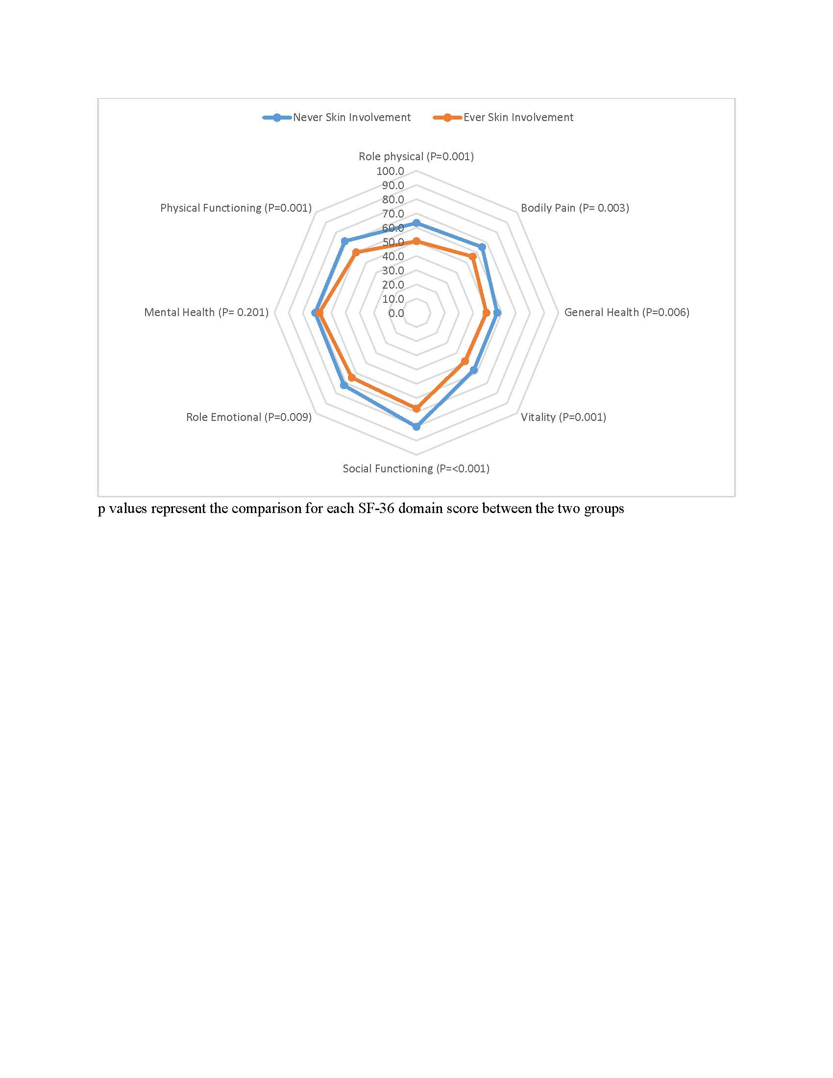 Figure 1. Comparison of SF-36 domains scores in SLE patients with and without skin involvement