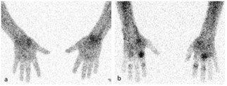 Results: Image analysis conducted before the biopsies has been able to separate the subjects into at least 2 distinct and nonoverlapping classes. TIL uptake in RA-inflamed joints was able to discretely differentiate patients with the fibroid pathotype (i.e., low macrophage involvement) from those having either the diffuse myeloid or lympho-myeloid pathotypes of RA (i.e., higher macrophage involvement). Seven of the subjects had relatively low levels of TIL uptake. All seven of these subjects were found to have the fibroid pathotype. Of the remaining 4 subjects, 3 had the diffuse myeloid pathotype and 1 had the lympho-myeloid pathotype. Those subjects with either the diffuse myeloid or lympho-myeloid pathotypes had, on average, more than 3 times more TIL uptake as the average subject with the fibroid pathotype (all 4 had higher uptake).