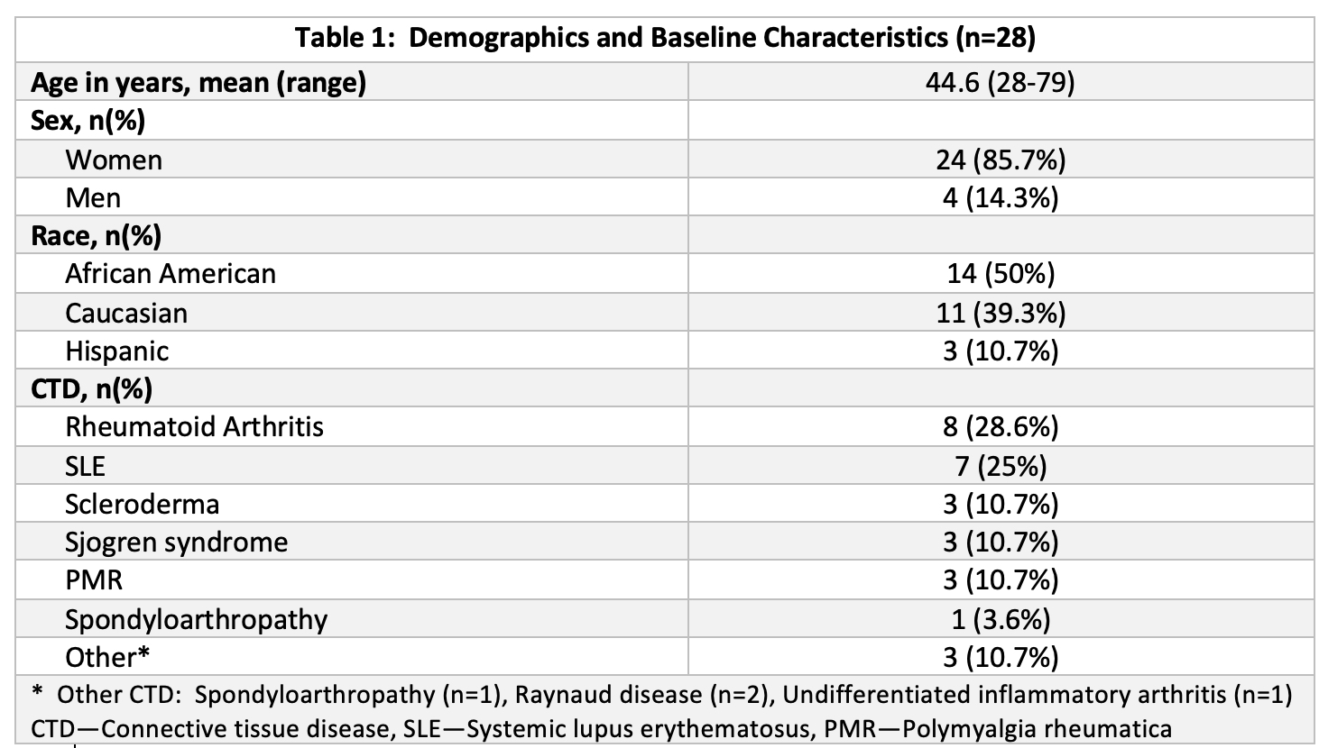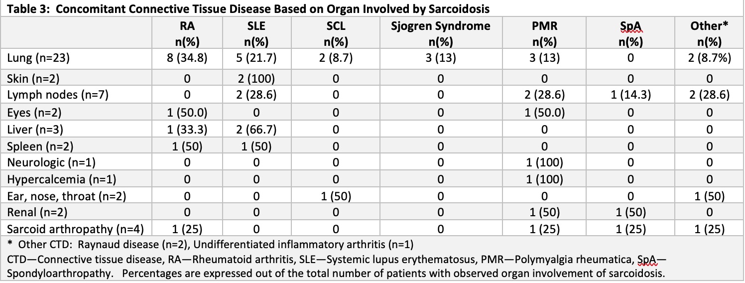 Methods: This was a retrospective chart review performed between January 1, 2007 and December 31, 2019. Adult patients identified via ICD codes were included if they carried a diagnosis of sarcoidosis with CTDs, including RA, SLE, scleroderma, Sjogren syndrome, polymyalgia rheumatica, or spondyloarthropathy. Patients with sarcoidosis had a tissue biopsy showing noncaseating granulomas or were identified clinically by a rheumatologist or pulmonologist. Patients with CTD were diagnosed by a rheumatologist. Data on time of diagnosis, demographics, clinical characteristics, and therapy were evaluated.