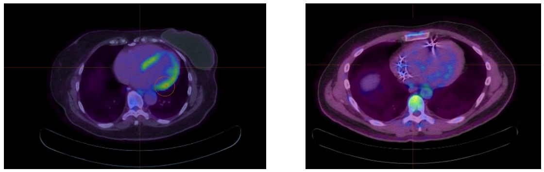 Figure 1: Cardiac PET Scan: Pre and Post treatment with corticosteroids and methotrexate Disclosures: P. Webster, None; Y. Rochlani, None; K. Loupasakis, None.
