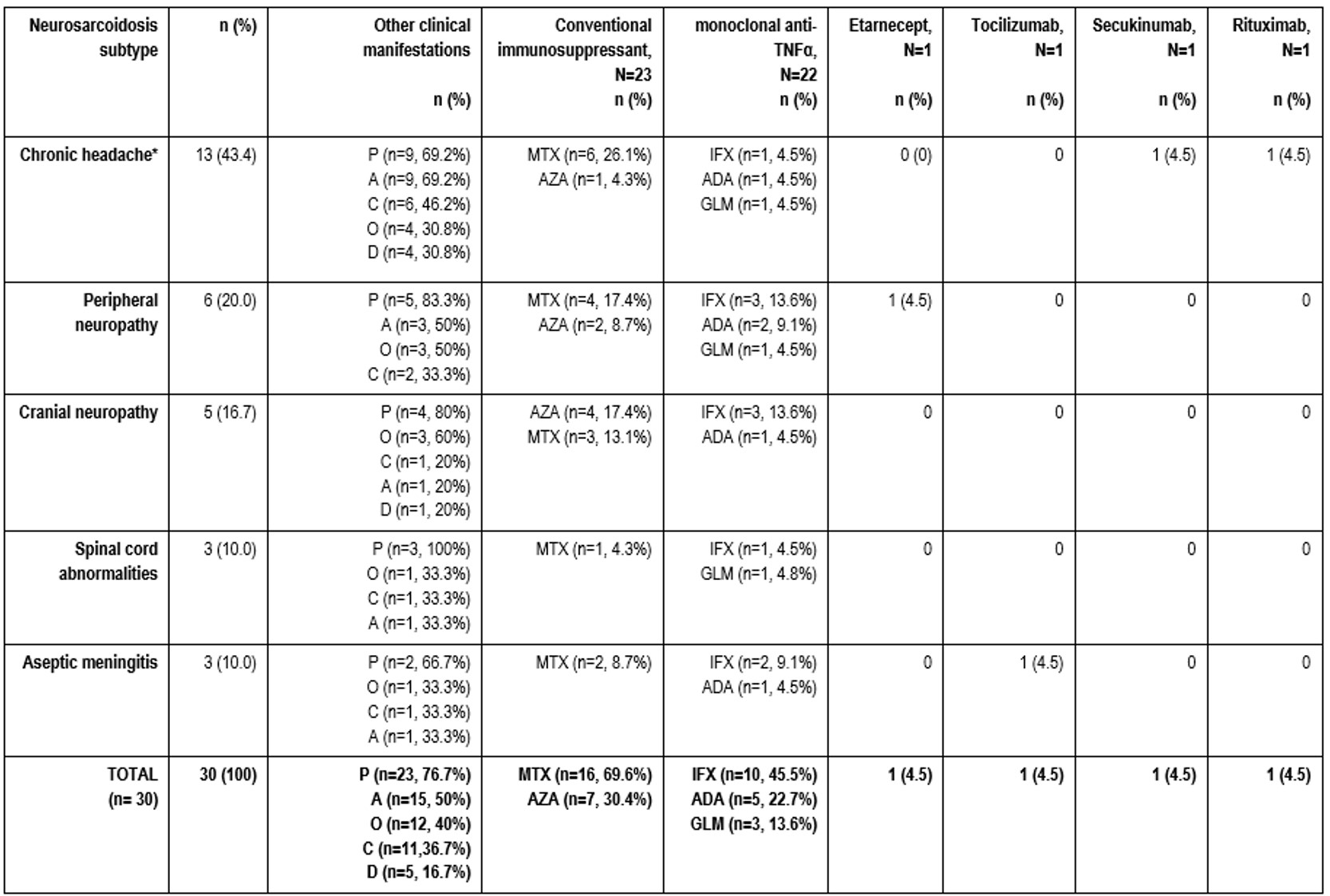 Conclusion: BT, especially monoclonal anti-TNFα, seems to be effective and safe in NS, regardless of subtype. TABLE: Treatment of 30 patients with neurosarcoidosis. Abbreviations: A: Articular, ADA: Adalimumab, AZA: Azathioprine, C: Cutaneous, D: Digestive, GLM: Golimumab, IFX: Infliximab, MTX: Methotrexate, O: Ocular, P: Pulmonar *With MRI, CSF, and/or EMG/NCS findings typical of granulomatous inflammation of the nervous system after rigorous exclusion of other causes and not meeting criteria for other neurosarcoidosis subtypes.