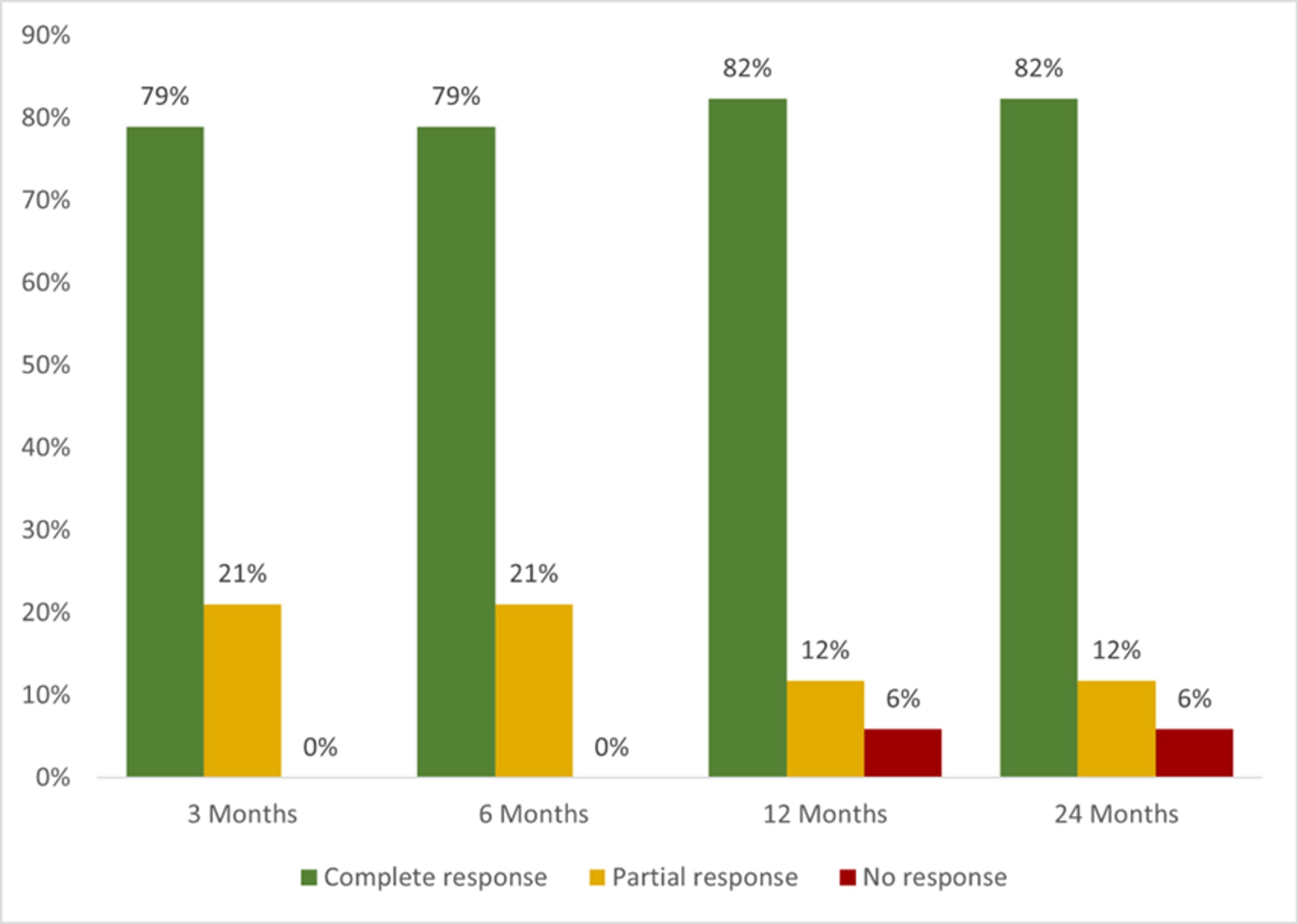 A total of 12 patients received treatment with 22 BT. Most used BT were monoclonal anti-TNFα (n=18, 81.8%), infliximab (IFX) (n= 10, 45.5%) and adalimumab (ADA) (n=5, 22.7%). After 12 months since the initiation of BT, complete, partial or no response was observed in 14 of 17 (82.4%), 2 (11.8%) and 1 patient (5.9%), respectively (FIGURE). Severe allergic reaction was observed in one patient on both IFX and ADA. No more severe adverse events were observed.