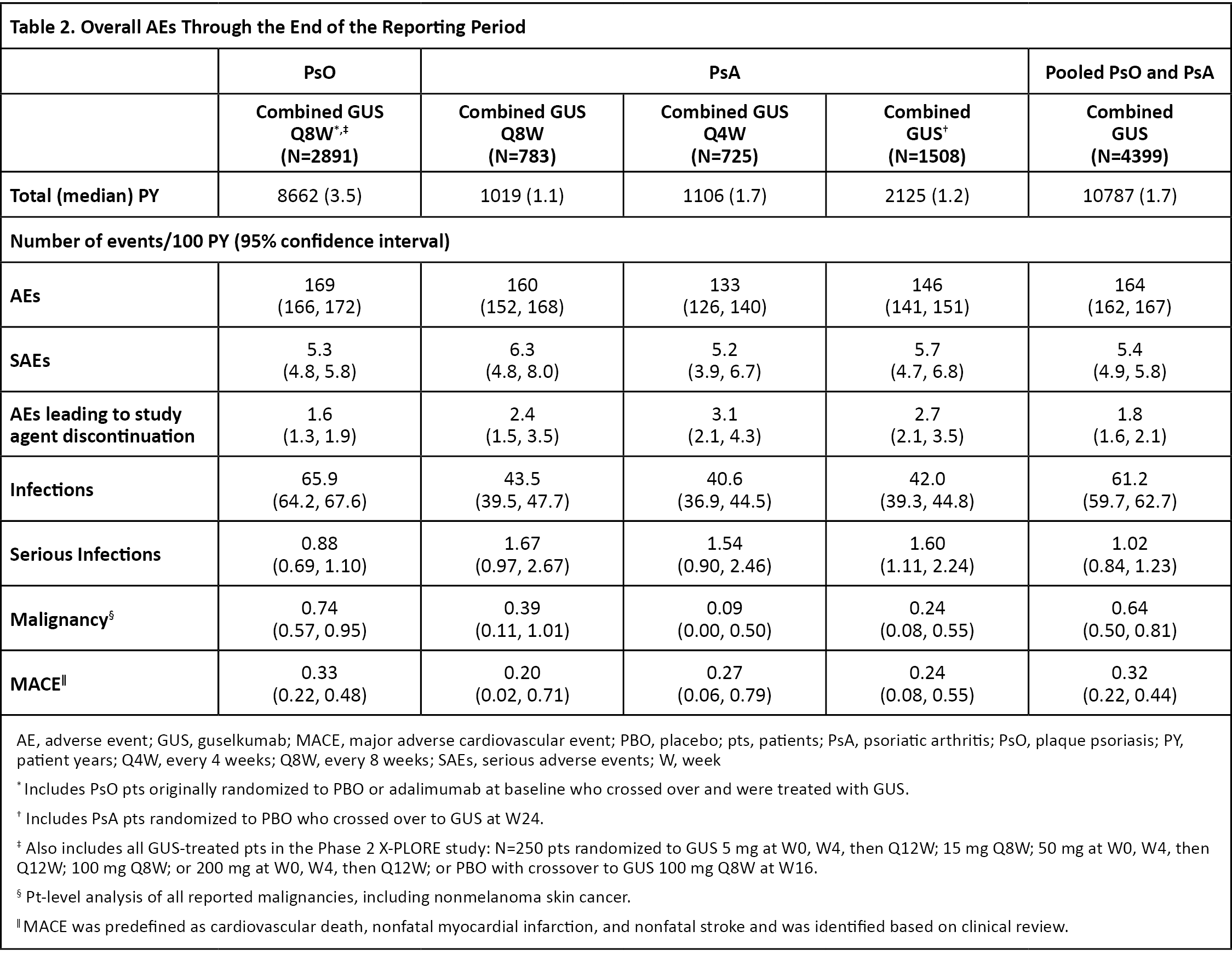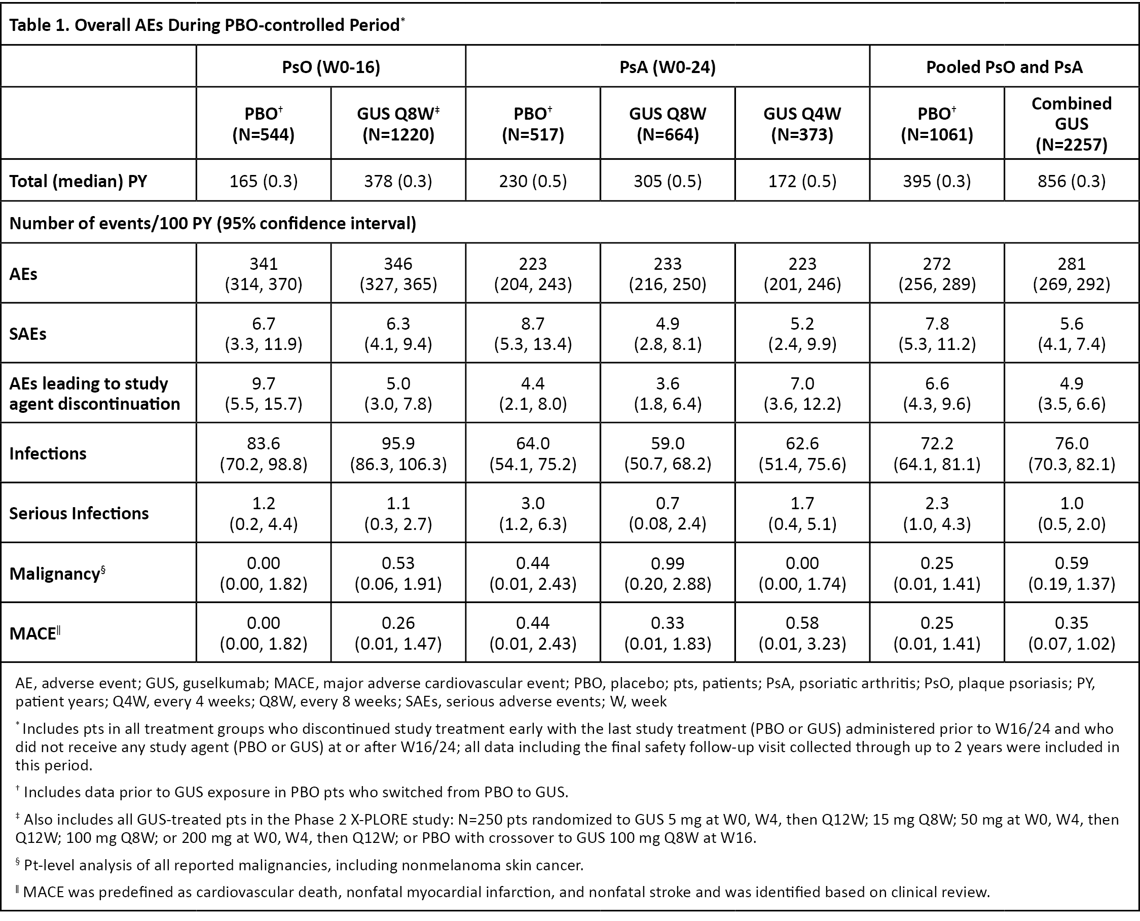 Results: During the PBO-controlled periods, 1061 patients received PBO (395 PY) and 2257 received GUS (856 PY). Through the end of the reporting periods, 4399 GUS-treated patients (PsO: 2891; PsA: 1508) contributed 10787 PY of follow-up (PsO: 8662 PY; PsA: 2125 PY). In PsO and PsA studies, pooled incidence rates of overall adverse events (AEs) were similar between GUS- and PBO-treated patients (Table 1). Rates of serious AEs (SAEs), AEs leading to study agent discontinuation, serious infections, malignancy, and major adverse cardiovascular events (MACE) were low and generally similar between GUS- and PBO-treated patients (Table 1). The rates of safety events evaluated remained consistent through the end of the reporting period for GUS-treated patients (Table 2). No cases of Crohn's disease or ulcerative colitis were reported in GUS-treated patients. No serum sickness-like or anaphylactic reactions related to GUS were reported. No opportunistic infections were reported in any GUS-treated PsO patients. Three cases of opportunistic infection were reported in pooled PsA studies (0.14/100 PY; all post-W52 in DISCOVER-2). No cases of active tuberculosis were reported across all studies.