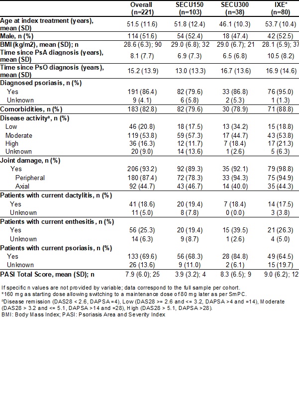 Conclusion: Most of PsA patients treated with anti-IL17 in Spain had a moderate or high disease activity, high peripheral joint damage and skin involvement and had received at least 1 previous bDMARDS/tsDMARDS. More than 80% of patients with one year follow-up were persistent to anti-IL17 treatments, observing the highest rate with IXE, followed by SECU150 and SECU300. Table 1- Demographic and clinical patient characteristics at baseline