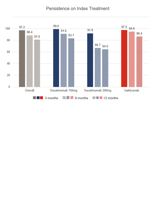 Methods: A multicenter retrospective study was conducted at 8 Spanish hospitals. Three cohorts of adult PsA patients, newly initiating treatment with an anti-IL17 (secukinumab 150mg [SECU150], secukinumab 300mg [SECU300] or ixekizumab [IXE]), between January-2019 and March-2020 were included. Data of patients exposed to anti-IL17 drugs and with a follow-up visit available were collected until March-2021. Demographic and clinical characteristics, treatment patterns, and persistence were analyzed descriptively. Continuous data were presented as mean (Standard Deviation (SD)) and categorical variables as frequencies with percentage. Persistence rates at 3/6/12 months were calculated.