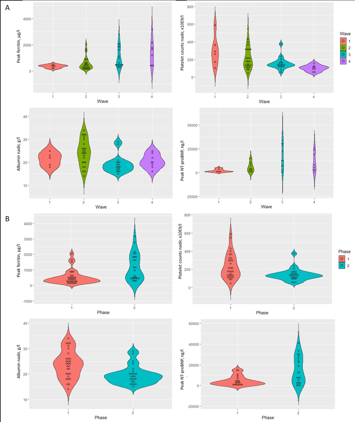 Figure 1: Violin plots depicting differences in key laboratory MIS-C features between the four waves (panel A) and both phases (phase one is wave one and two combined, phase two is wave three and four combined; panel B) of the COVID-19 pandemic: peak ferritin values, platelet counts nadir, albumin nadir values, and peak NT-proBNP values.