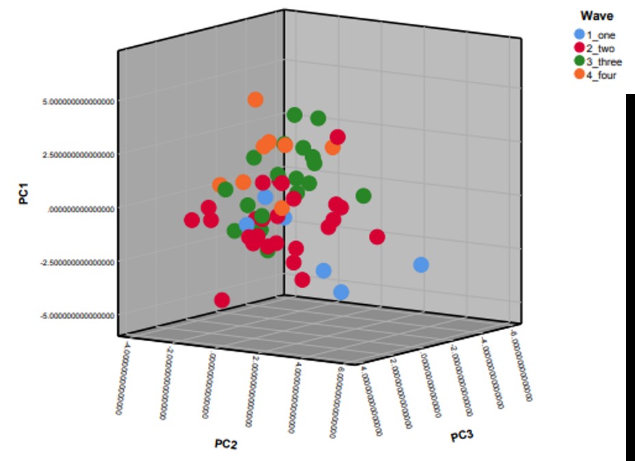 Figure 2: Three-dimensional plot of the first three principal components (PC1, PC2, PC3) resulting from principal component analysis explaining about 30% of the variance in the data. A clustering of MIS-C patients from the first and second wave, and from the third and fourth wave can be observed.
