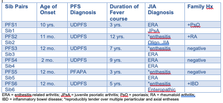 Results: 147 unique patients with periodic fever syndromes were evaluated over the course of this 14-year interval. Of these, 49 (33.1%) were classified as PFAPA without need for genotyping. 73 (49.7%) were genotyped, with 26 (35.6%) having an identified monogenic AID, while 47 (64.4%) had negative results and were assigned a diagnosis of undifferentiated PFS (UDPFS). In comparing the UDPFS patients to the PFAPA group, we found that the UDPFS group contained a higher percentage of females (62% versus 48%) and was more ethnically diverse. There was no statistical difference in age of onset, fever periodicity, duration of episodes, or time to remission. We identified a number of sibling pairs in our PFS population, and 6 pairs comprised one sib with PFS and the other with JIA; 5 out of these 6 PFS sibs were classified as UDPFS. While fevers in these UDPFS sibs remitted, all progressed to a JIA phenotype consistent with early enthesitis-related arthritis or psoriatic arthritis.