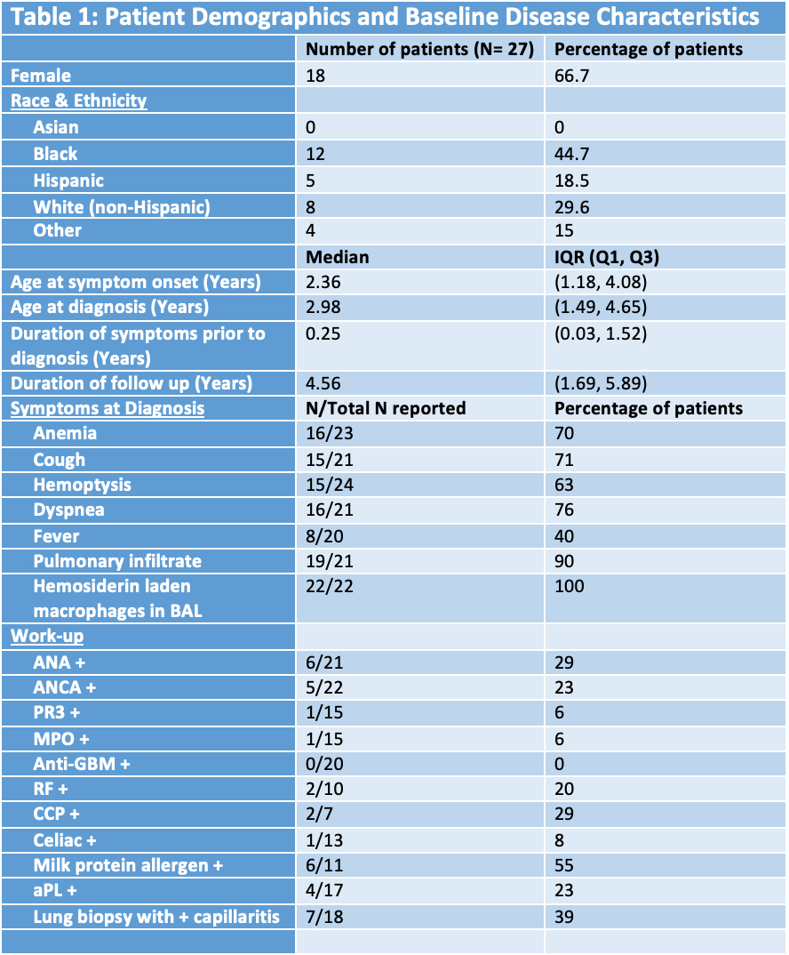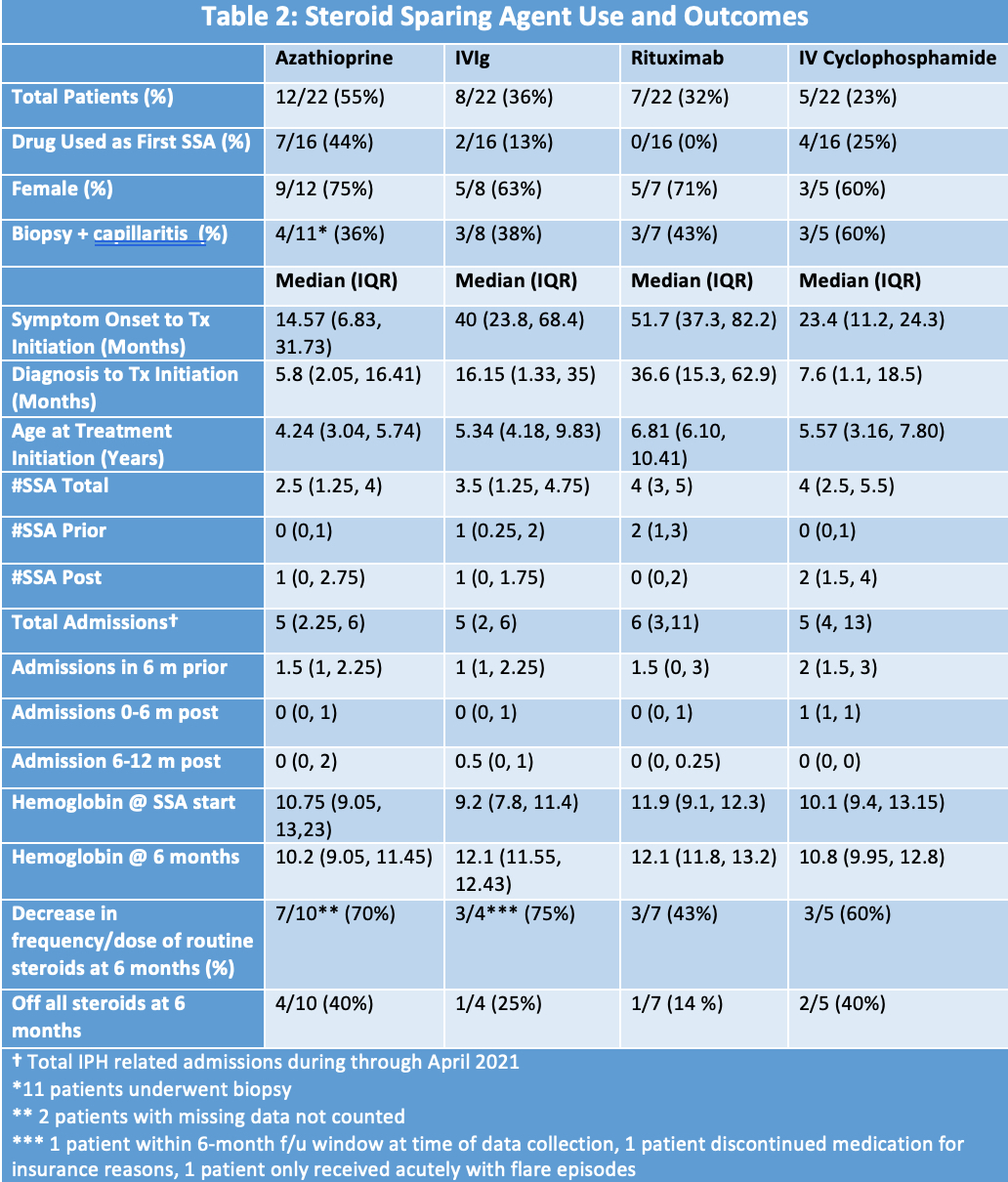 Methods: Retrospective, cohort study was conducted at a tertiary-care children's hospital. EHR was queried for IPH codes associated ICD 9/10 codes. Patients (age < 19) were included who had: symptom onset between 1/2012 and 4/2021; diagnosis of IPH by a physician; and either bronchoalveolar lavage (BAL) fluid with hemosiderin-laden macrophages and/or lung biopsy pathology consistent with alveolar hemorrhage without evidence of other disease. Patients were excluded for a known alternative cause for pulmonary hemorrhage or anticoagulation use at diagnosis. Data was collected on: CS dosing (IV & PO) at SSA initiation & 6 months (per drug); hospitalizations in prior 6 months & year following initiation; and hemoglobin level at SSA initiation & 6 months. Primary outcome was decrease in CS dose 6 months after SSA initiation defined as: decrease in weight adjusted, daily oral dose without increase in frequency of IV interval; spacing of IV interval without increase in daily oral dose: or decrease in both daily oral dose and frequency of IV dose. Descriptive analysis was performed.