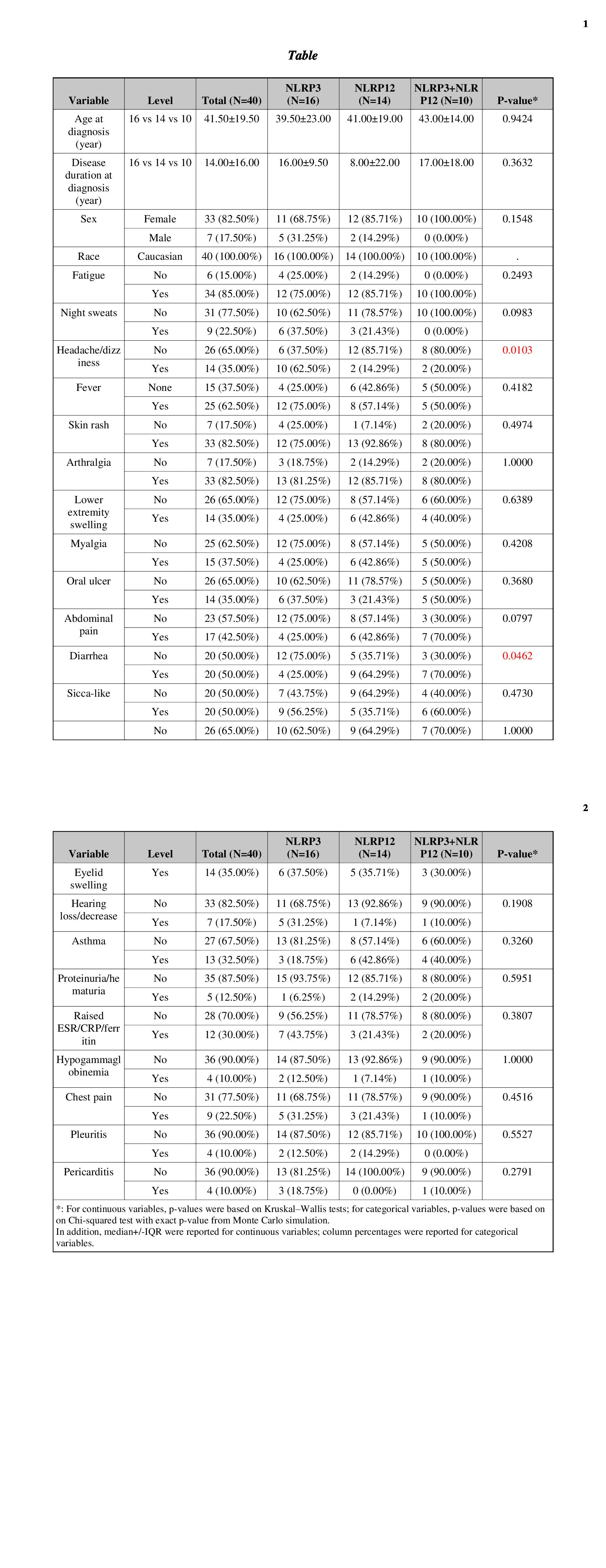 Conclusion: Our study involves the largest cohort of adult patients with NLRP3-and NLRP12-AID. The comparitive study has shown phenotypic similarities largely and significant diffferences in certain aspects between these two diseases. We provide our experience in the diagnosis, classification and management for these NLR-associated autoinflammatory diseases. The Demographic, Clinical and Laboratory Data of Patients