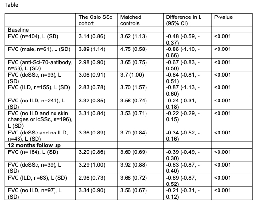 Conclusion: Mean FVC at baseline was significantly lower in SSc patients compared to the reference population. As expected, SSc patients with ILD had impaired FVC, but also patients without ILD and in patients with limited skin changes. This highlights the importance of other factors than ILD on lung function in SSc patients. Disclosures: H. Fretheim, Bayer, GSK and Actelion; I. Barua, None; Ø. Midtvedt, Jannsen, Boehringer-Ingelheim; T. Garen, None; P. Diep, Boehringer Ingelheim; M. Durheim, boehringer ingelheim and roche, Boehringer ingelheim and Roche; C. Brunborg, None; A. Hoffmann-vold, Boehringer-Ingelheim, Actelion, Janssen, Roche, Merck/MSD, ARXX Therapeutics, Eli Lilly, Medscape, EUSTAR, EULAR, ACR, ERS.