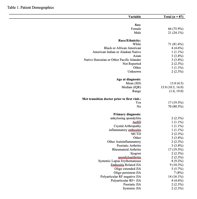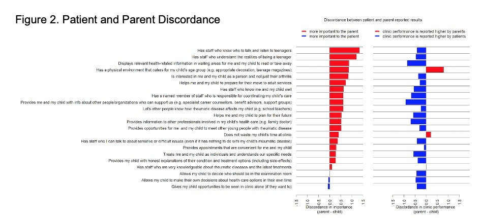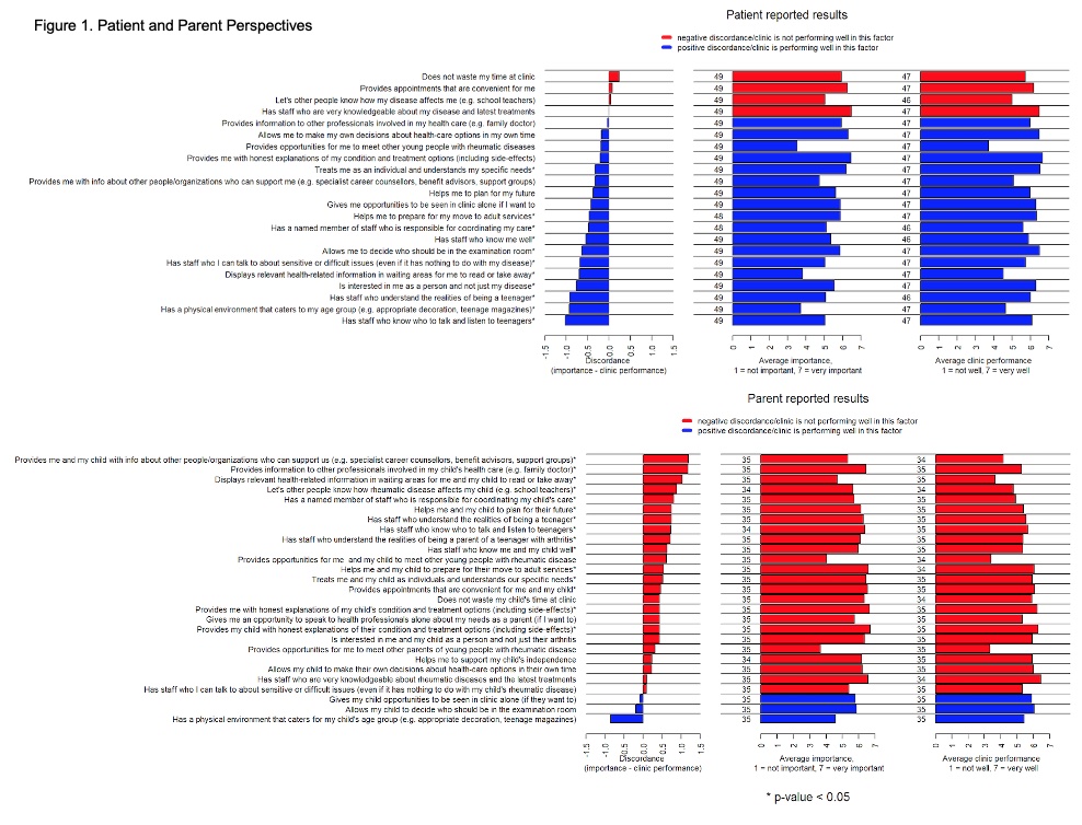 Methods: Patients and their parents were recruited if they were cared for in the ACCORD clinic and had a rheumatic disease diagnosis. Patients and their parents were asked to complete a Mind the Gap survey via email. This previously validated survey has 44 questions, using 7-point Likert scales to rate 1) the importance of 22 factors in a transition clinic and 2) how well the transition clinic currently performs these 22 factors. Patients and parents completed this survey independently. Survey responses are presented as averages. Discordance between patient and parent responses are provided. Discordance between how well the clinic is performing those factors are provided.