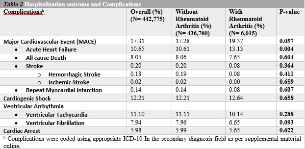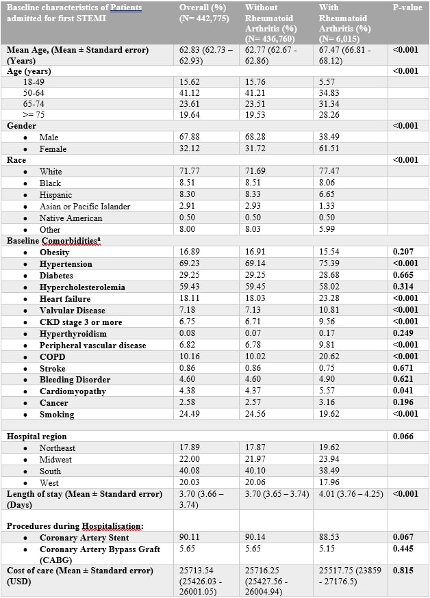 Table 1. Baseline demographic characteristics, clinical comorbidities, and Invasive procedures for hospitalization for first STEMI in patients with and without Preexisting Rheumatoid Arthritis;