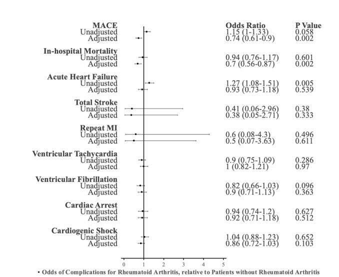 Figure 1: Unadjusted and adjusted odds ratios* for the overall complication, in-hospital mortality, acute heart failure, total stroke, repeat MI, Ventricular tachycardia, Ventricular fibrillation, cardiac arrest, cardiogenic shock