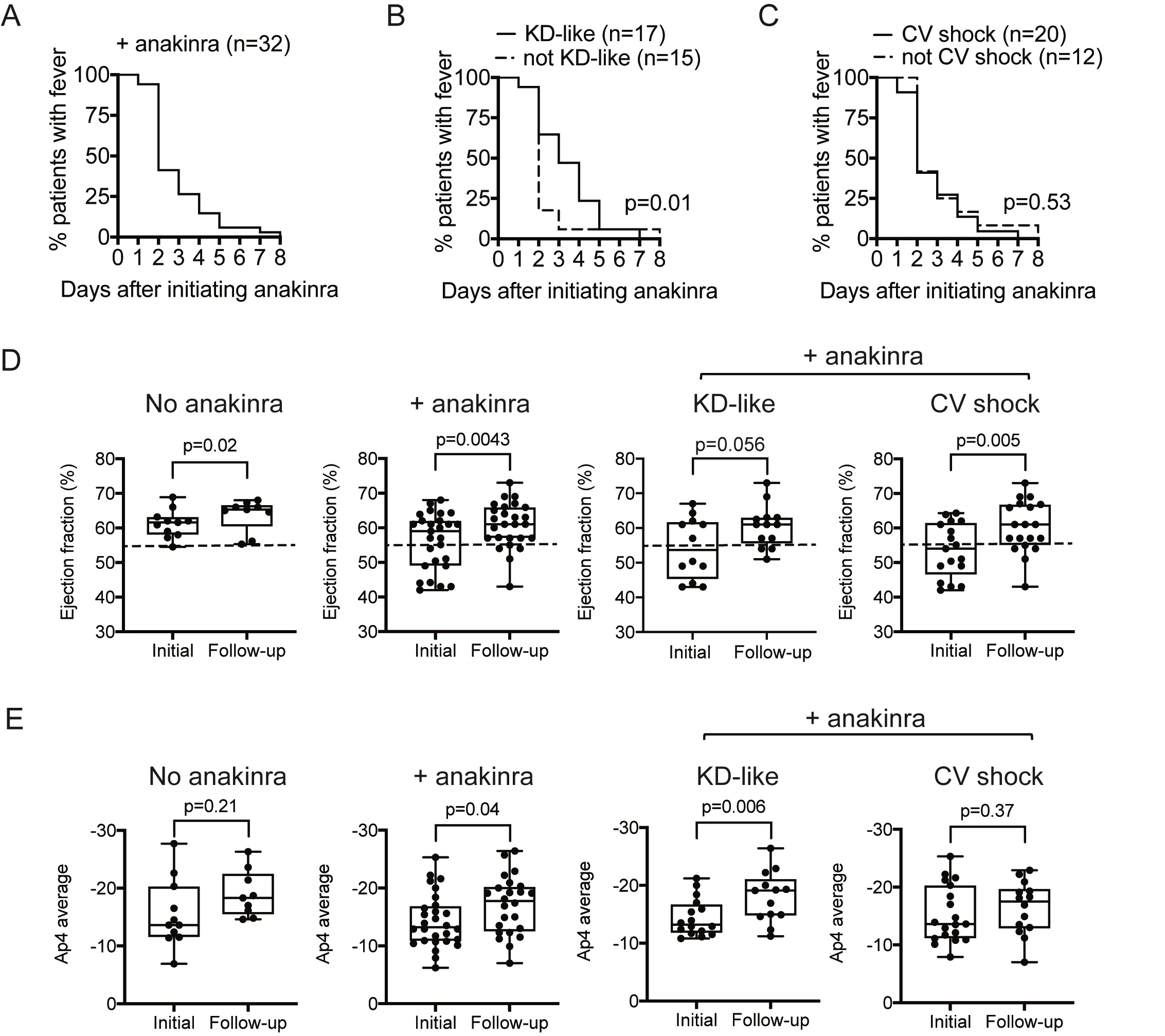 Primary outcome measurements of MIS-C patients with non-specific, KD-like, and CV shock clinical phenotypes treated with anakinra. The effect of anakinra on defervescence in all patients receiving anakinra (A), as well as those with KD-like features (B) and CV shock phenotypes (C), is shown. Left ventricular ejection fractions (LVEF) on initial and repeat echocardiograms in MIS-C patients who did not receive anakinra (-anakinra) with those who received anakinra (+anakinra), as well as the LVEF of MIS-C patients with KD-like features or CV shock who received anakinra, is shown in D. The lower limit of normal LVEF (55%) is indicated by the dotted lines. Ap4 cardiac strain on initial and repeat echocardiograms in MIS-C patients who did not receive anakinra (-anakinra) with those who received anakinra (+anakinra), as well as MIS-C patients with KD-like features or CV shock who had received anakinra, is shown in E. Data were analyzed for statistical significance by log rank test (B and C) or non-parametric two-tailed Wilcoxon matched pairs signed rank test (D and E), and a p-value < 0.05 was considered statistically significant.