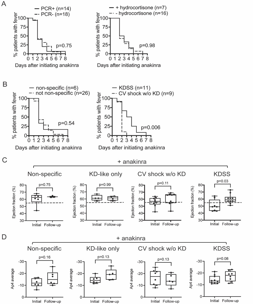 Primary outcome measurement of MIS-C patients with anakinra stratified by non-specific, KD-like only, CV shock only, and KDSS clinical phenotypes. Resolution of fever in MIS-C patients treated with anakinra and stratified by SARS-CoV-2 PCR status or in CV shock patients treated with anakinra and stratified by treatment with stress hydrocortisone are shown in A. Left ventricular ejection fractions (LVEF) on initial and repeat echocardiograms in MIS-C patients with non-specific, KD-like only, CV shock without KD-like features (w/o KD), and KDSS phenotypes are shown in C. In D, the effects of anakinra in apical (Ap4) cardiac strain in MIS-C patients with non-specific, KD-like only, CV shock without KD-like features (w/o KD), and KDSS phenotypes are shown. Data were analyzed for statistical significance by log rank test or non-parametric Wilcoxon matched pairs signed rank test. A p-value < 0.05 was considered statistically significant. KD= Kawasaki disease-like, KDSS= Kawasaki disease shock syndrome, PCR= SAR-CoV2 polymerase chain reaction.