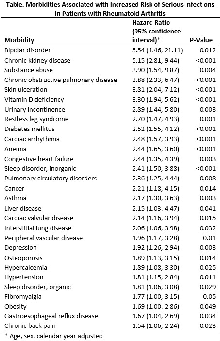 Conclusion: This population-based study highlights several morbidities associated with increased risk of serious infections in patients with RA. Future studies may aim to combine a similar comprehensive comorbidity risk profile with other known infection risk factors such as medications and smoking status to create improved predictive models for serious infection. Disclosures: B. Kimbrough, None; C. Crowson, None; R. Lennon, None; J. Davis, Pfizer; E. Myasoedova, None.