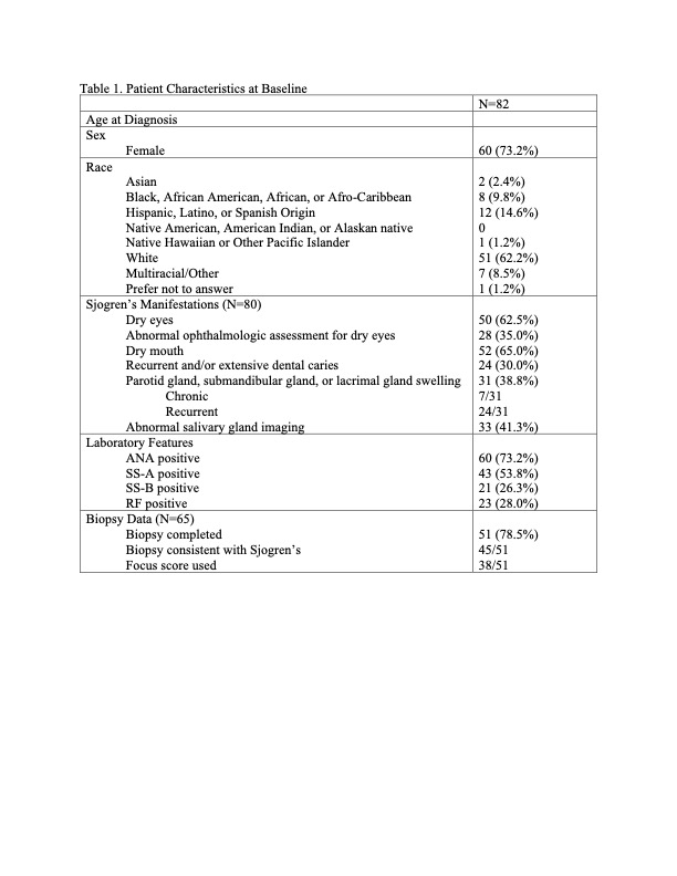 Results: Of the 82 patients with primary childSD in the registry, the cohort was majority female (73.2%) and white (62.2%) (Table 1). The average age of diagnosis was 13.4 years (10.8, 16.6). The most common clinical features were dry mouth (65.0%) and dry eyes (62.5%). Evaluation for childSD were notable for positive SS-A in 53.8%, abnormal salivary gland imaging in 41.5%, and a biopsy consistent with childSD in 62.2%. Almost all patients received disease-modifying therapies (DMARDs) (81/82) with the most common being hydroxychloroquine (95.1%), methotrexate (23.2%), and mycophenolate/mycophenolic acid (19.3%) (Table 2). Hydroxychloroquine monotherapy was seen in 41.5% of the cohort, and 26.8% were treated with a biologic. Topical ocular medications were not commonly used.
