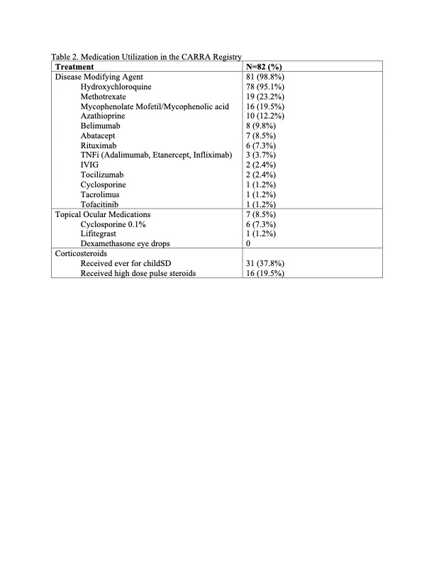 Table 2. Medication Utilization in the CARRA Registry Disclosures: E. Treemarcki, None; M. Basiaga, None; S. Lieberman, None; S. Stern, None.
