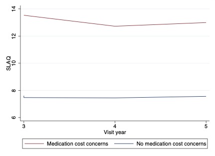 Figure 1: Temporal association between medication cost concerns and mean SLAQ score in the CLUES cohort