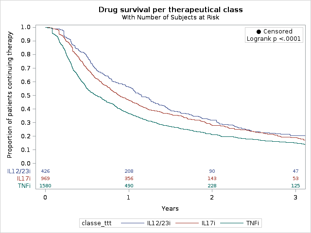 Conclusion: Overall, this real-life study shows low persistence rates for all biologic at 3 years in second-line PsA patients previously exposed to TNFi. However, those persistence rates were higher with IL17i or IL12/23i than with TNFi. Disclosures: L. Pina Vegas, None; E. sbidian, None; P. Claudepierre, AbbVie/Abbott, MSD, UCB, Pfizer, Lilly, Novartis, Janssen, Galapagos, Amegn, biogen.