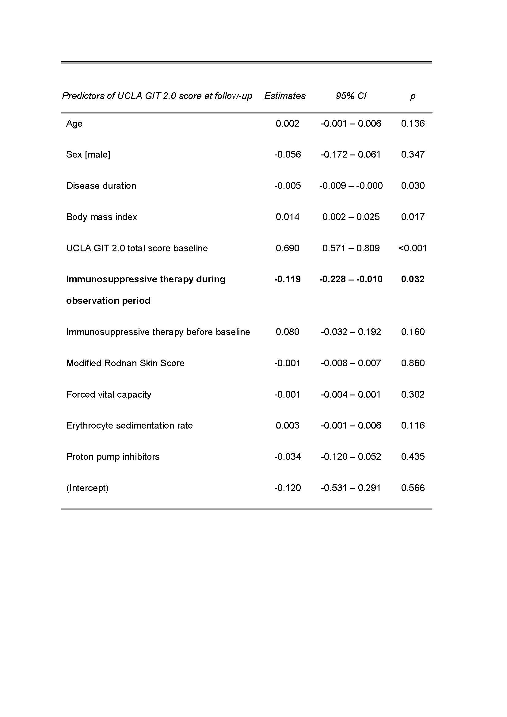 Baseline factors associated with the total UCLA GIT 2.0 score at the end of the observation period. Multiple linear regression model with imputation for missing variables. Nf209 patients