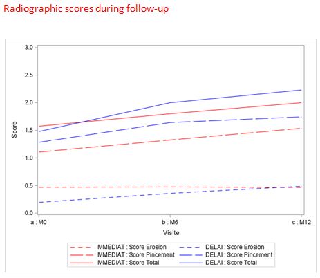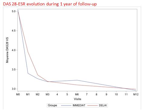 There was a significant difference in the means of DAS28-ESR at 1 month between the DELAY and IMMEDIAT groups (3.96 ± 1.46 vs 3.41 ± 1.33; p< 0.001, respectively). There was no significant difference in the means of DAS28-ESR between the 2 groups at 3 months (3.19± 1.46 in the 2 groups p< 0.91), at 6 months (3.11 ± 1.42 vs 3.24 ± 1.43; p=0.46, respectively) and at 12 months (2.96 ± 1.34 vs 2.98 ± 1.26p=0.89) (Graphic). Similarly, there was no significant difference in mean radiographic scores at 6 months (2.00 ± 4.41 vs. 1.80 ± 4.03 p=0.81) or at 12 months (2.23 ± 4.86 vs. 2.00 ± 4.07 p=0.93).