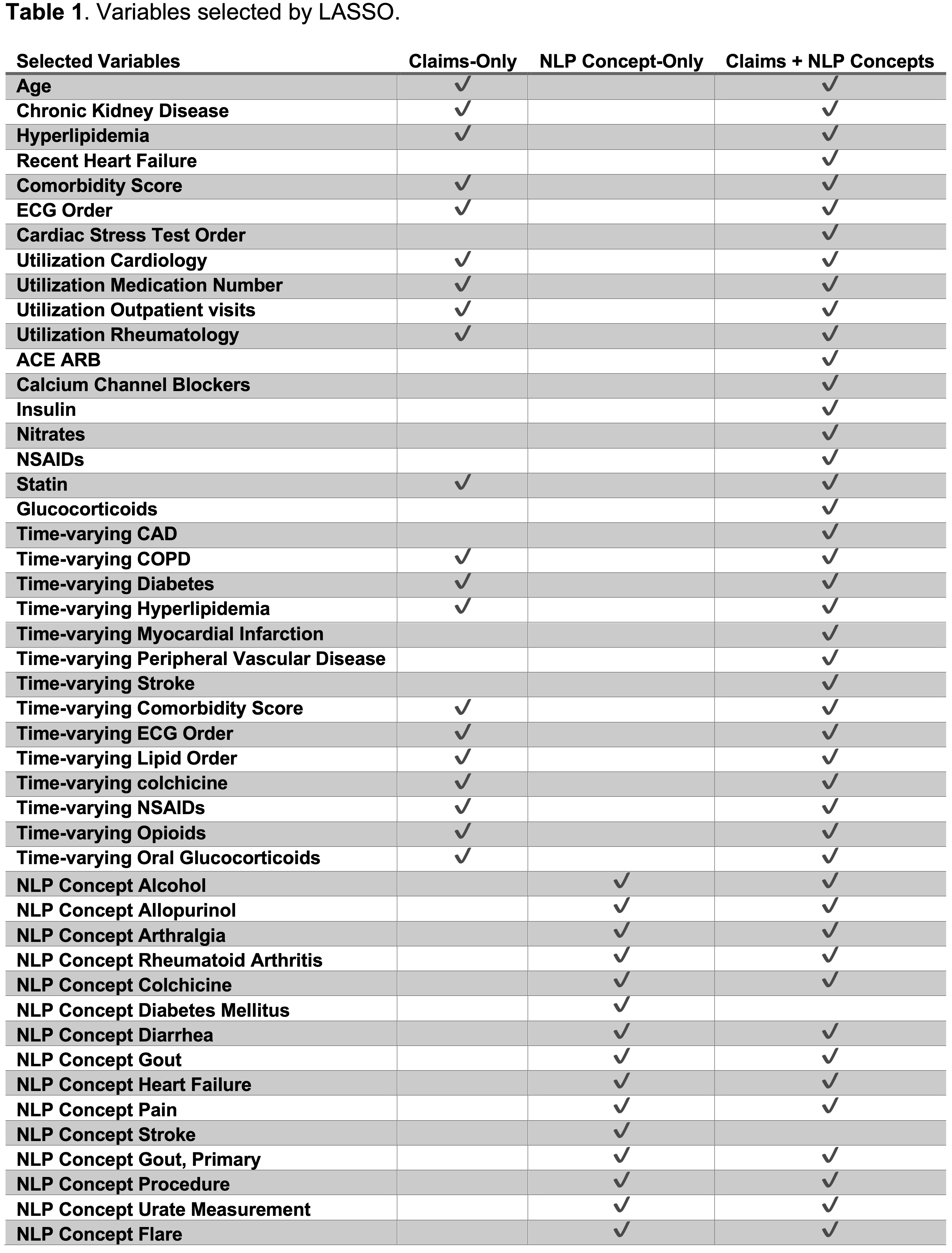 Table 1. Variables selected by LASSO.