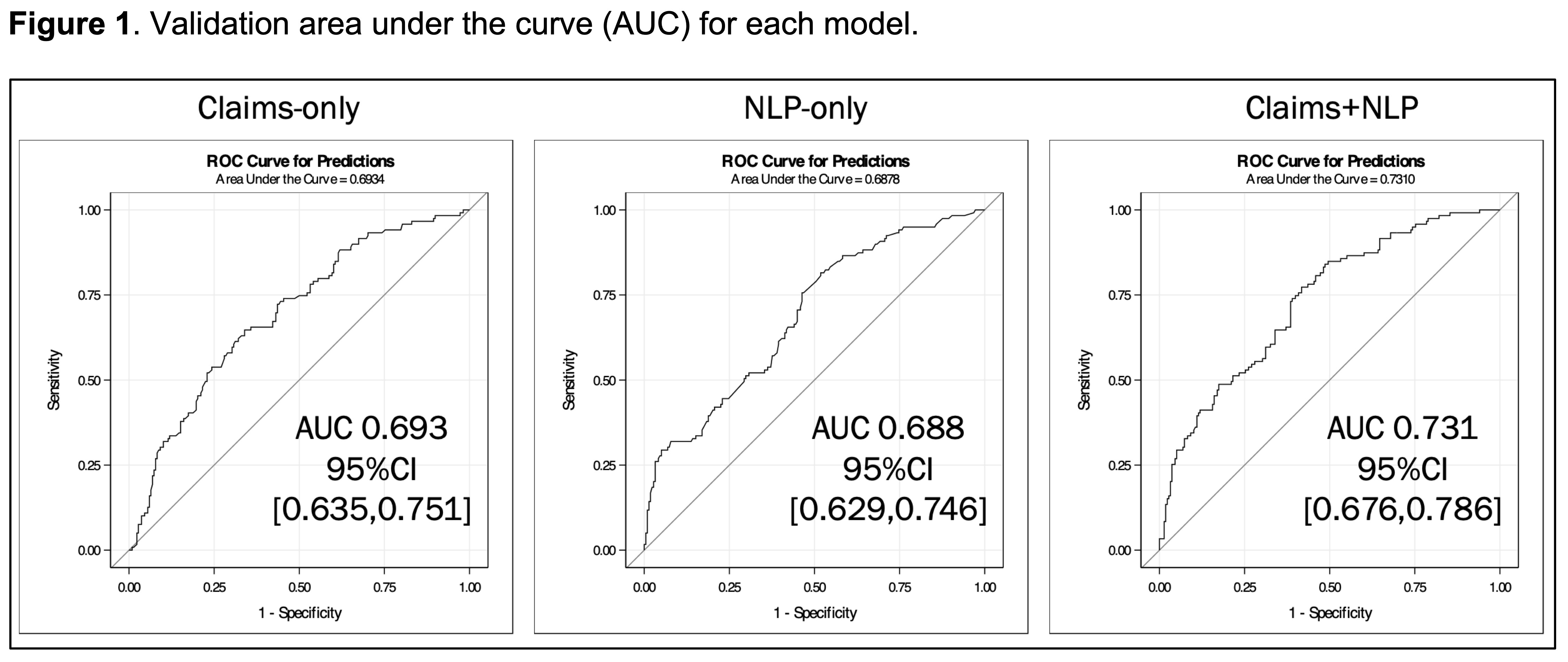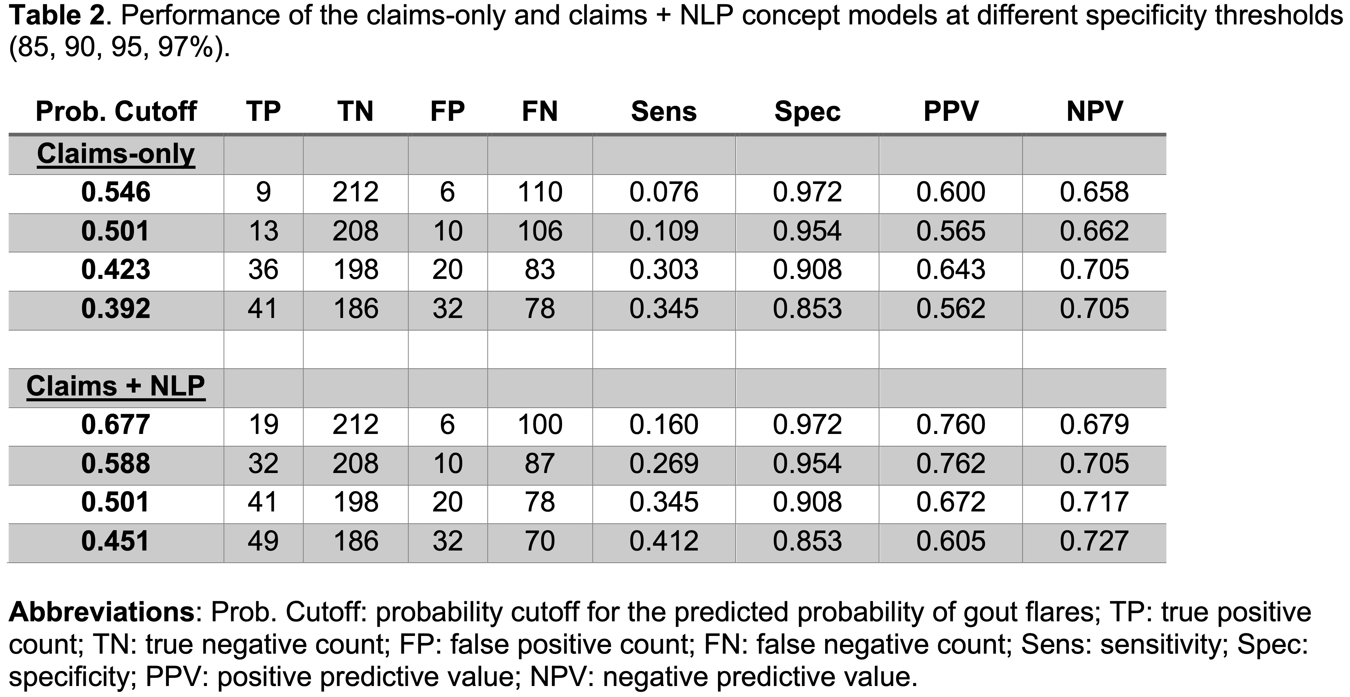 Table 2. Performance of the claims-only and claims + NLP concept models at different specificity thresholds (85, 90, 95, 97%).