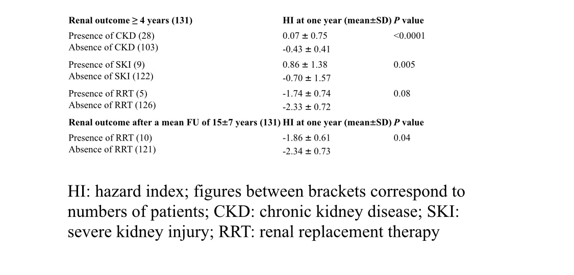 Results: As illustrated in the Table, the mean HI for CKD and SKI, measured at one year, were significantly higher in the groups of patients who indeed developed CKD and SKI after a FU of ≥ 4 years compared to those who did not. The mean HI for RRT was higher in patients who developed RRT after ≥ 4 years but the difference was not statistically significant (p=0.07), most likely due to the small numbers of RRT in this series at this time-point (n=5). After a longer FU (mean ± SD: 15 ± 7 years), more RRT were observed (n=10) and the mean HI for RRT became significantly higher in patients suffering from RRT compared to those who did not. Of note, clinical (gender, age, mean serum creatinine, mean serum creatinine, mean proteinuria) and pathological (ISN/RPS class) characteristics did not differ at baseline between patients with poor long-term renal outcome compared to the others.