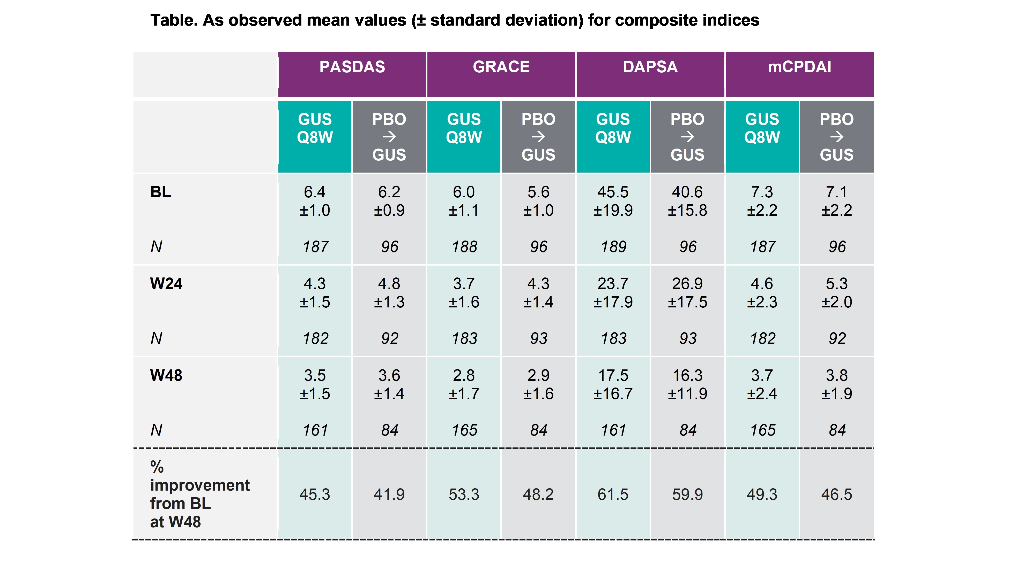 Results: Overall, 167/189 (88%) GUS and 83/96 (86%) PBOàGUS pts completed the study through W44. Pts had active disease, with similar BL mean values for PASDAS, GRACE, DAPSA and mCPDAI between GUS and PBO groups (Table). Across these indices, GUS pts demonstrated robust improvements (45–62%) in mean scores from BL to W48 (Table). PBO pts who crossed over to GUS at W16 or W24 also showed rapid improvement in their index scores, with mean values and % improvement at W48 consistent with those observed in pts randomized to GUS at BL (Table).