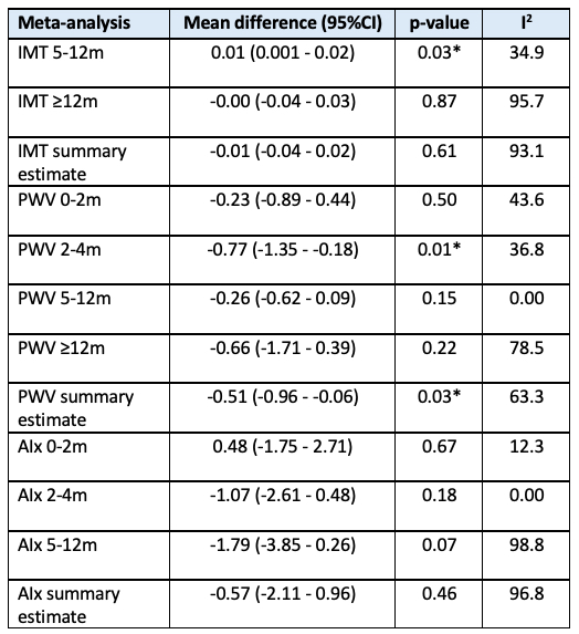 Results: 30 studies were identified from 1436 records, of which 23 were included in the meta-analysis. For IMT, there was a slight increase in the first months of follow-up, however the long-term follow-up revealed no progression (mean difference (MD) overall timepoints 0.01 mm (95%CI -0.04 - 0.02), p=0.61). PWV and AIx showed a decrease after treatment (PWV: MD -0.51 m/s (95%CI -0.96 - -0.06), p=0.03; AIx: MD -0.57 % (95%CI -2.11 - 0.96), p=0.46). Heterogeneity was high in the overall analyses and subgroups with long follow-up periods (≥12 months).
