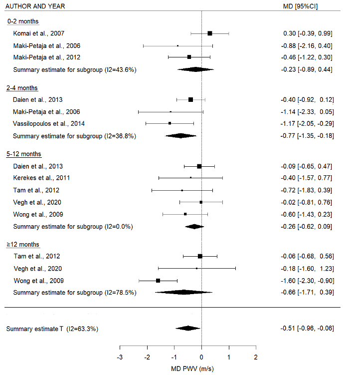 Figure 1. Forest Plot for PWV comparing different time intervals Data are presented as mean difference over time in meter/second with 95% confidence interval. Summary estimate T: the model includes all timepoints, except when in one study the same patients were measured multiple times, the longest follow-up time was used. PWV: pulse wave velocity; MD: mean difference; m/s: meter/second; 95%CI, 95% confidence interval. Disclosures: E. van Geel, None; B. Abdulmajid, None; A. Blanken, None; M. Nurmohamed, AbbVie/Abbott.