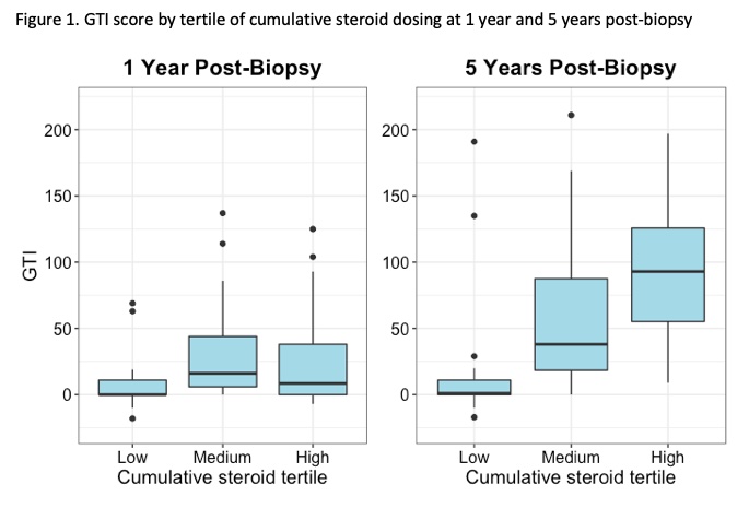 Methods: We performed a single-center retrospective cohort study using the Beth Israel Deaconess Lupus Cohort, which was initiated in 2006. All patients enrolled in the cohort met the 1997 ACR diagnostic criteria for systemic lupus erythematosus. We included patients with biopsy-confirmed LN between 2006 and 2016 to have five years of available data post-biopsy for all patients. Cumulative glucocorticoid exposure was collected via medical record review from date of the diagnostic kidney biopsy through one- and five-years post-biopsy. Glucocorticoid dosing was converted to prednisone equivalents. The composite GTI was calculated using published methods using medical record review and adding the scores for all documented glucocorticoid-associated toxicities through one year and through five years post-biopsy. Positive points were given to worsening toxicities and negative points to improvement in toxicities. We performed linear regression to determine the association between cumulative glucocorticoid exposure and GTI scores through 1 year and 5 years following diagnosis.