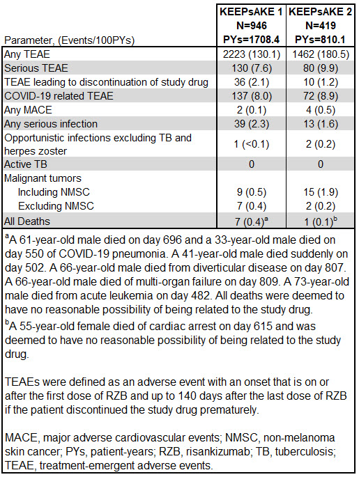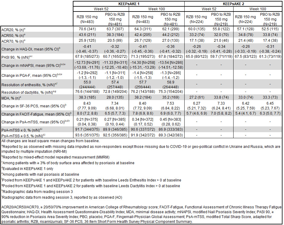 Results: At week 100, patients in KEEPsSAKE 1 (RZB N=483; PBO/RZB N=481) and KEEPsAKE 2 (RZB N=224; PBO/RZB N=219) had similar results to those reported at week 52 (Table 1). Achievement of ACR20, 50, and 70 overtime results for both studies are presented in Figure 1. In KEEPsAKE 1, ACR20 at week 100 was achieved by 64.3% and 62.1% of RZB and PBO/RZB patients, respectively. In KEEPsAKE 2, 57.1% of RZB and 52.5% of PBO/RZB patients achieved ACR20 at week 100. PASI 90 achievement levels in KEEPsAKE 1 were 71.3% for RZB patients and 67.8% for PBO/RZB patients. In KEEPsAKE 2, 67.5% of RZB and 61.3% of PBO/RZB patients achieved PASI 90. Patients also maintained HAQ-DI scores in both KEEPsAKE 1 (RZB -0.41, PBO/RZB -0.36) and KEEPsAKE 2 (RZB -0.26, PBO/RZB -0.31). For patients with nail psoriasis at baseline both PGA-F scores (KEEPsAKE 1 RZB -1.4, PBO/RZB -1.3) and mNAPSI scores (KEEPsAKE 1 RZB -11.33, PBO/RZB -13.54) were maintained. Resolution of enthesitis for patients with enthesitis at baseline was seen in 60.6% of RZB and 62.1% of PBO/RZB patients in KEEPsAKE 1 and 51.7% of RZB and 53.2% of PBO/RZB patients in KEEPsAKE 2. Resolution of dactylitis for patients with dactylitis at baseline was seen in 75.4% of RZB and 77.9% of PBO/RZB KEEPsAKE 1 patients and 77.5% of RZB and 68.4% of RZB/PBO patients in KEEPsAKE 2. As of the week 100 cut-off, the EAERs of any TEAE in KEEPsAKE 1 patients was 130.1/100PY and 180.5/100PY for KEEPsAKE 2 patients (Table 2).